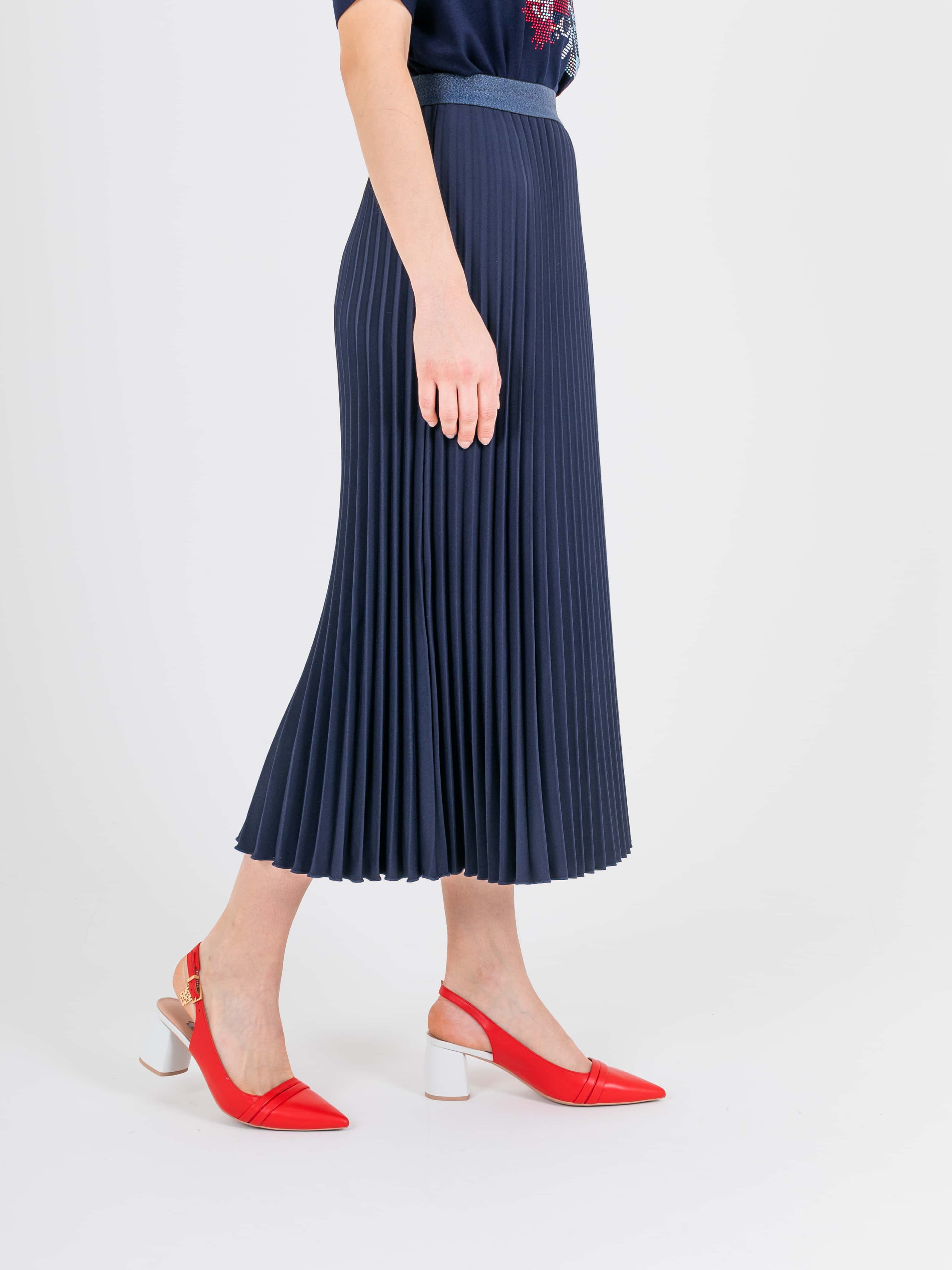 Легкая юбка полусолнце длиной до щиколоток, дизайнерская особенность модели – плиссировка. Верх юбки обработан резинкой.