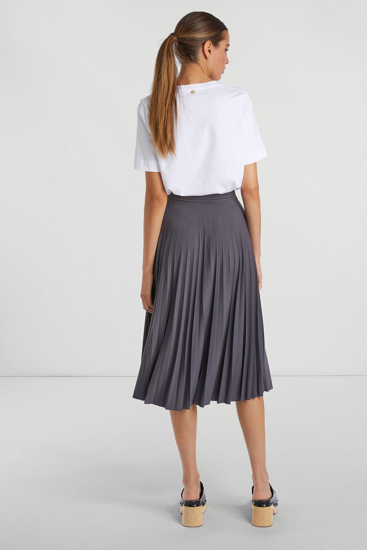 Плиссированная юбка длины миди подчеркнет вашу женственность. Пояс эластичный и впечатляет своим красивым декором, который умело подчеркивает вашу талию.