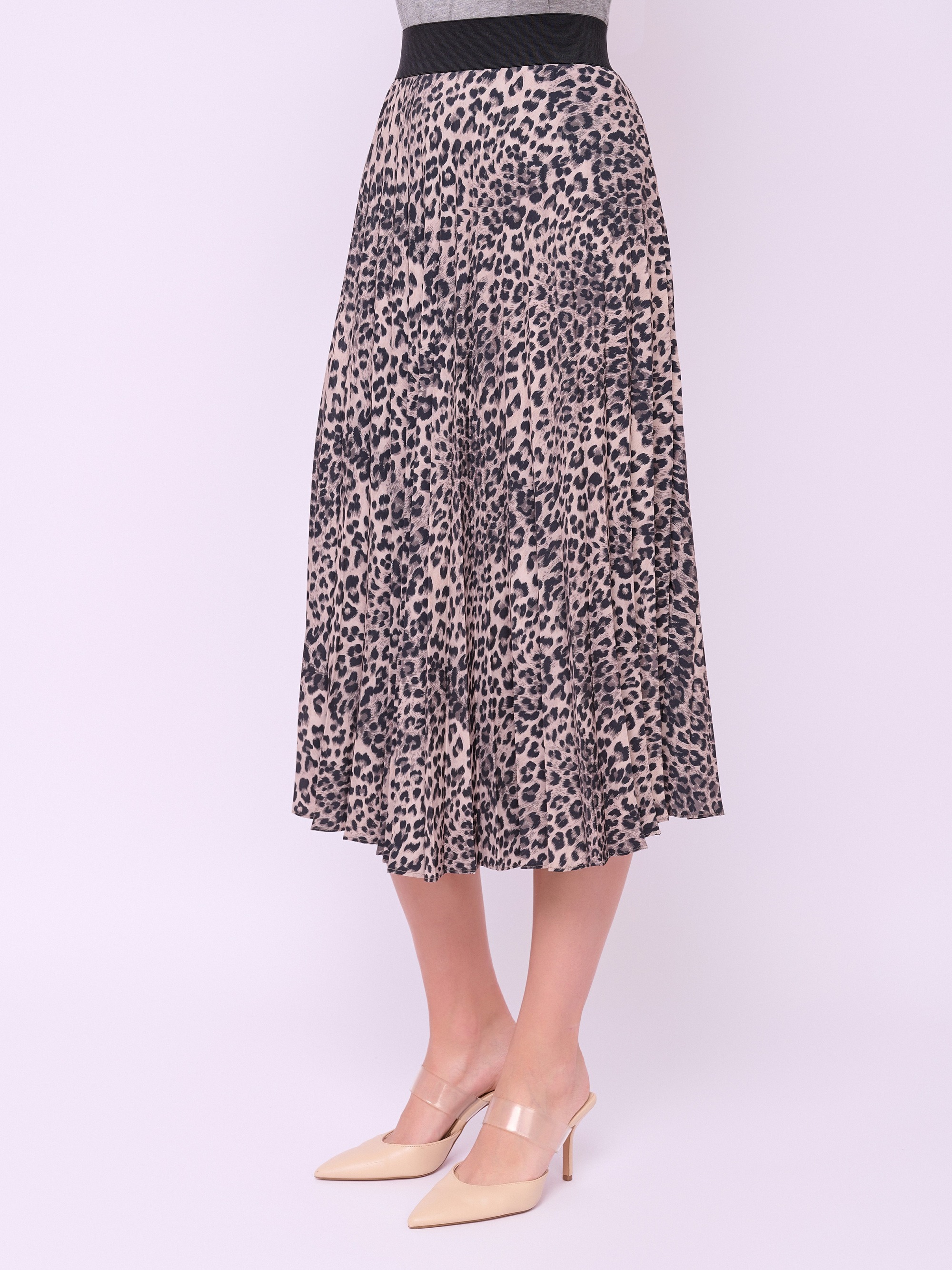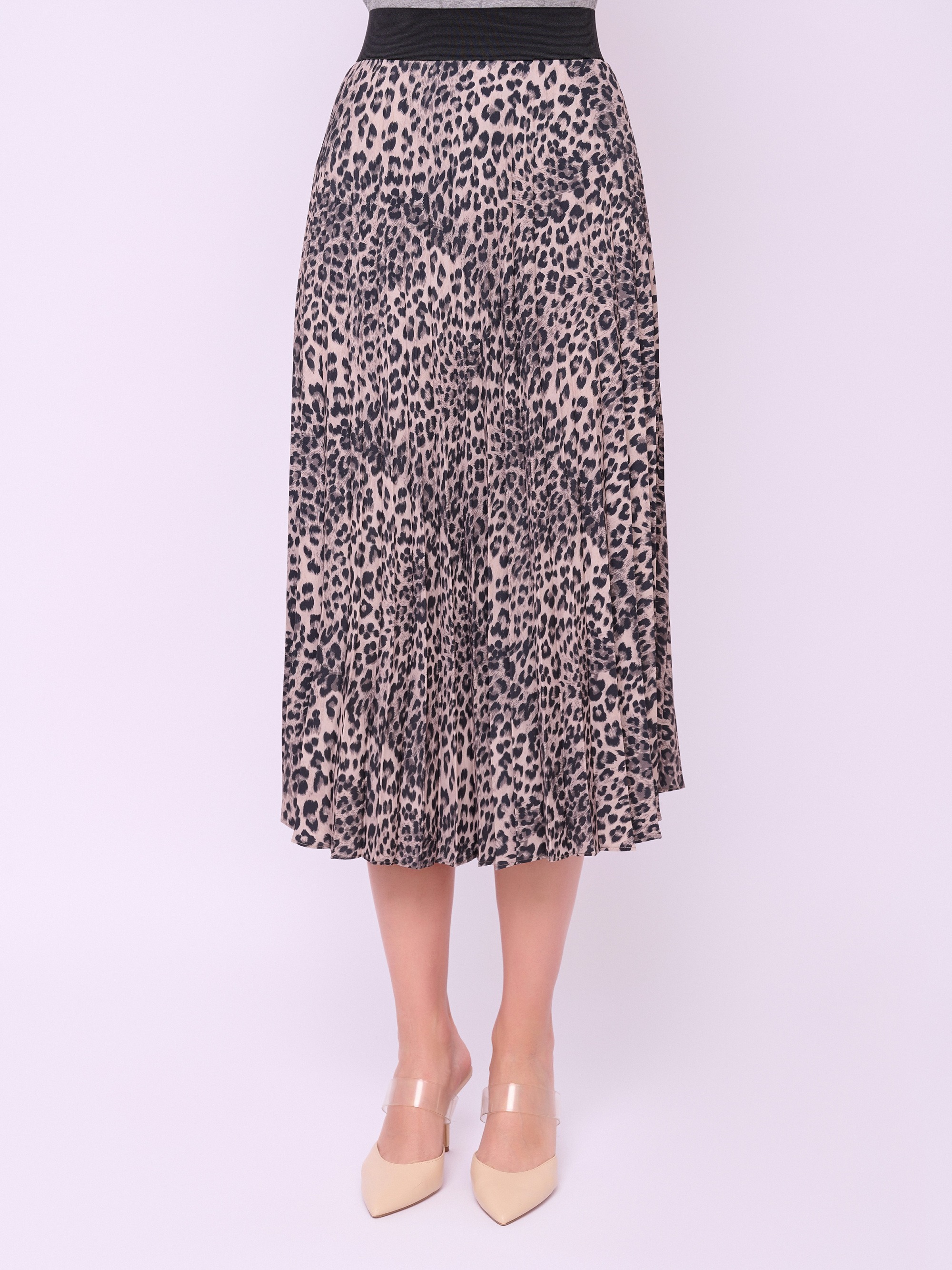 Плиссированная юбка средней длины на широкой резинке из ткани с анималистическим рисунком. Длина по спинке: 81 см.