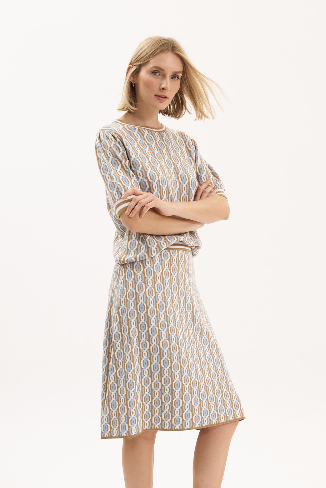 Короткая трикотажная юбка-трапеция с разноцветным узором «шрелья» в медовом/небесно-голубом/белом цветах. Мягкий пояс. Длина: 62 см.