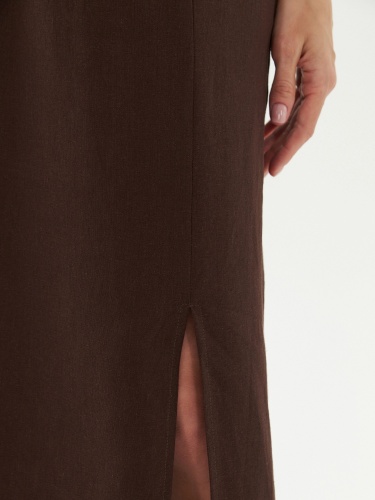 Юбка трапеция на резинке со шнурком из основной ткани для регулировки прилегания по талии. Юбка миди выполнена из льняной ткани в шоколадном цвете. По переду разрез.