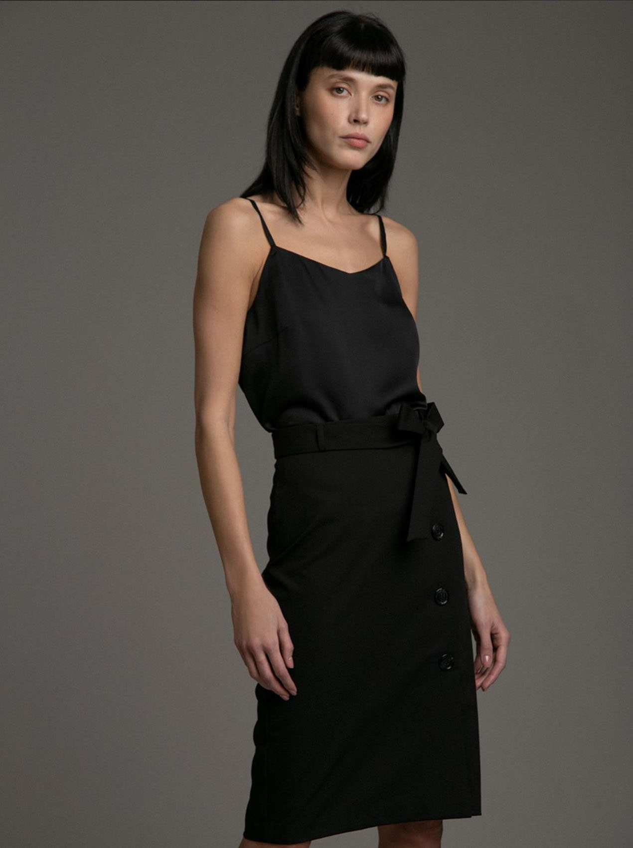 Пуговицы в тренде. Вариация на тему юбка-карандаш. Пуговицы спереди делают модель маст-хэв сезона, а пояс в форме банта создает дополнительный акцент на талии и придает женственности строгому силуэту.