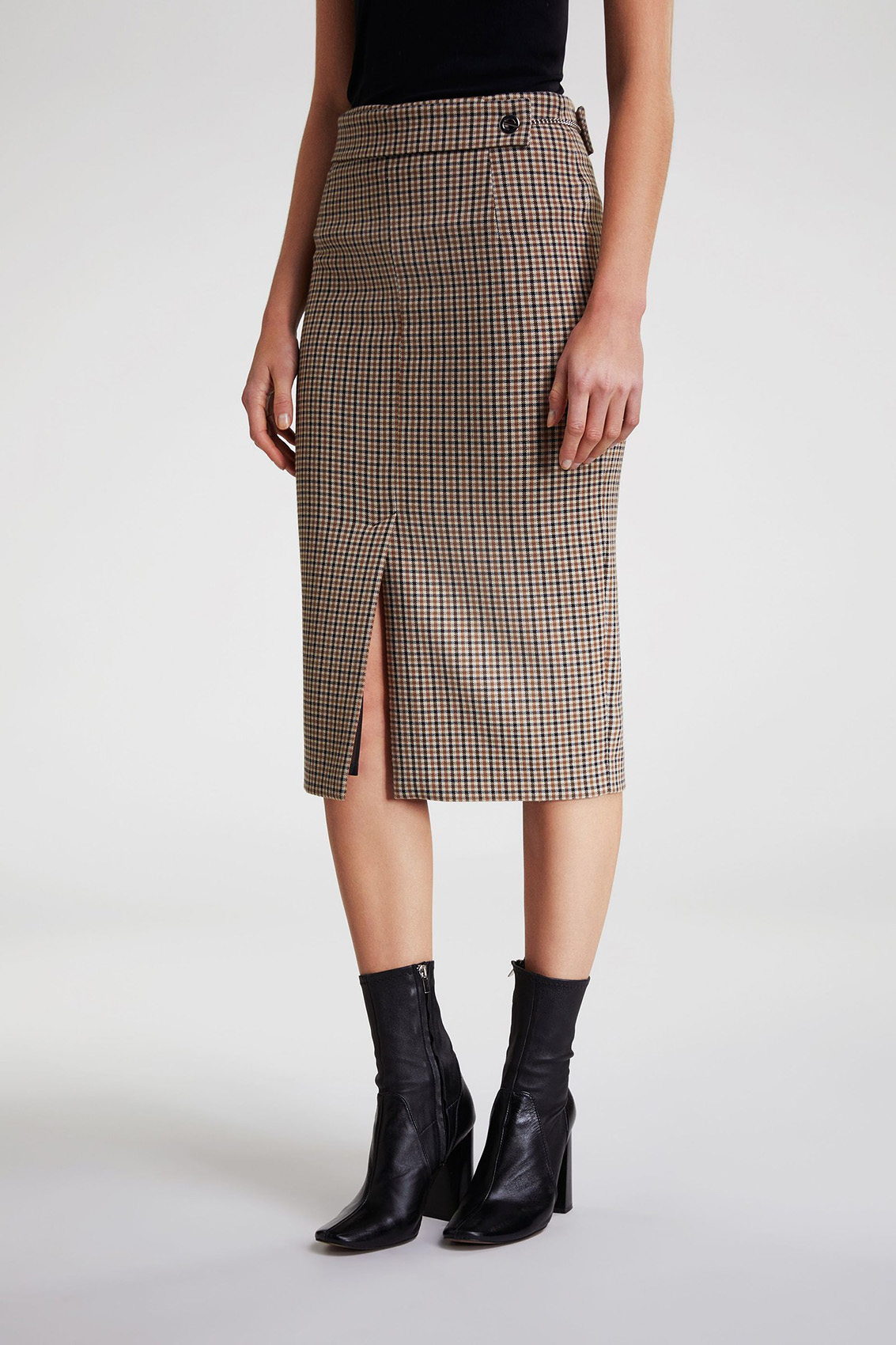 Классическая юбка-карандаш удивляет количеством модных элементов! Средняя посадка, длина чуть ниже колен. Трендовый принт в клетку. Разрез со шлицей спереди. Декоративный пояс на цепочке. Эта юбка станет изюминкой множества стильных образов.