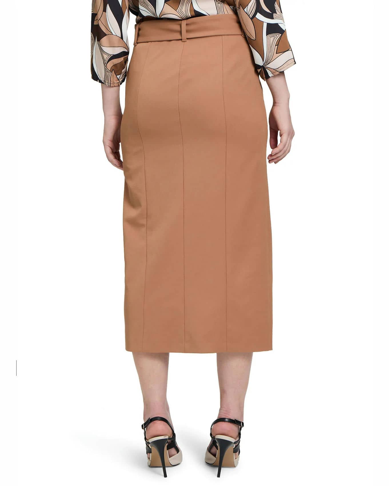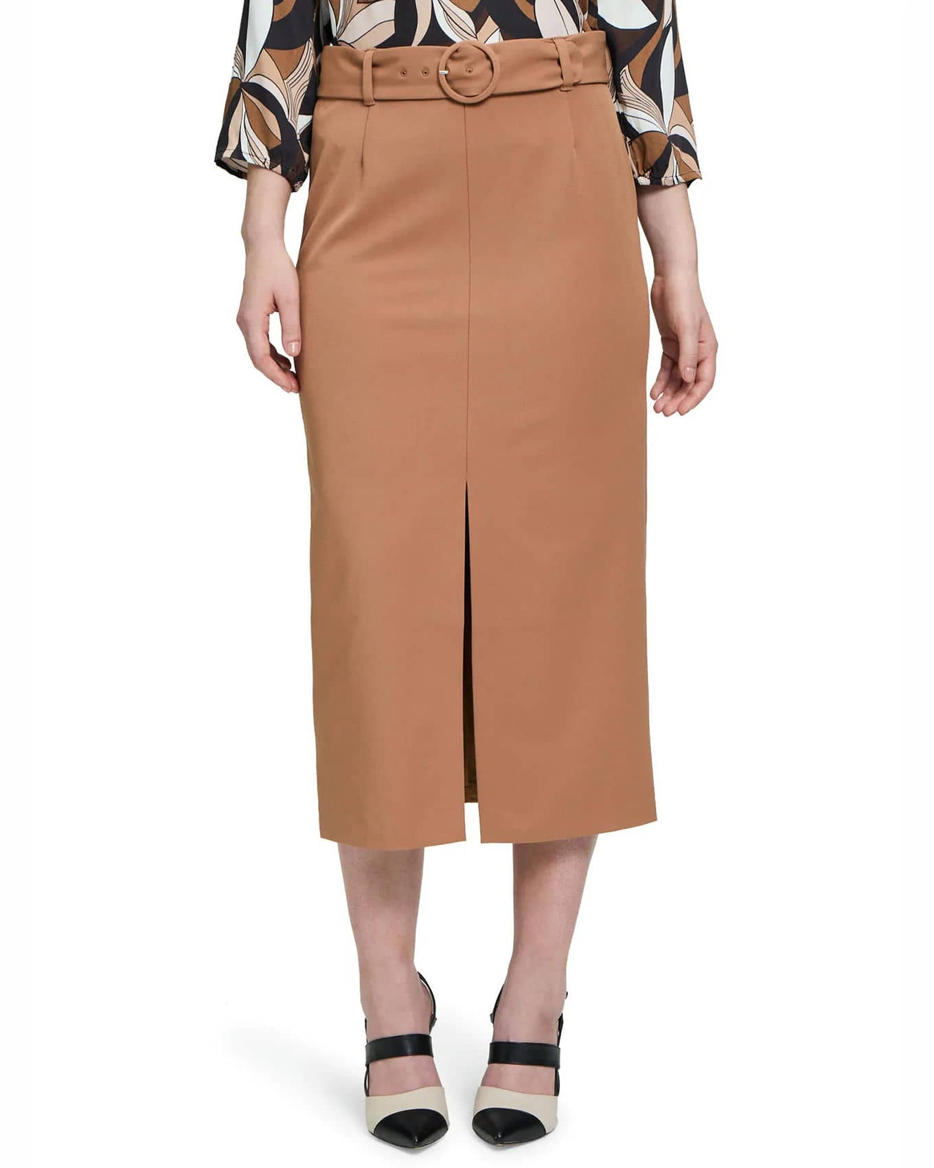 Юбка-карандаш бежевого цвета. Модель высокой посадки со вставным поясом с пряжкой. Длина миди, имеется эффектный разрез по центру шва спереди. Юбка-карандаш - незаменимая классика делового стиля.