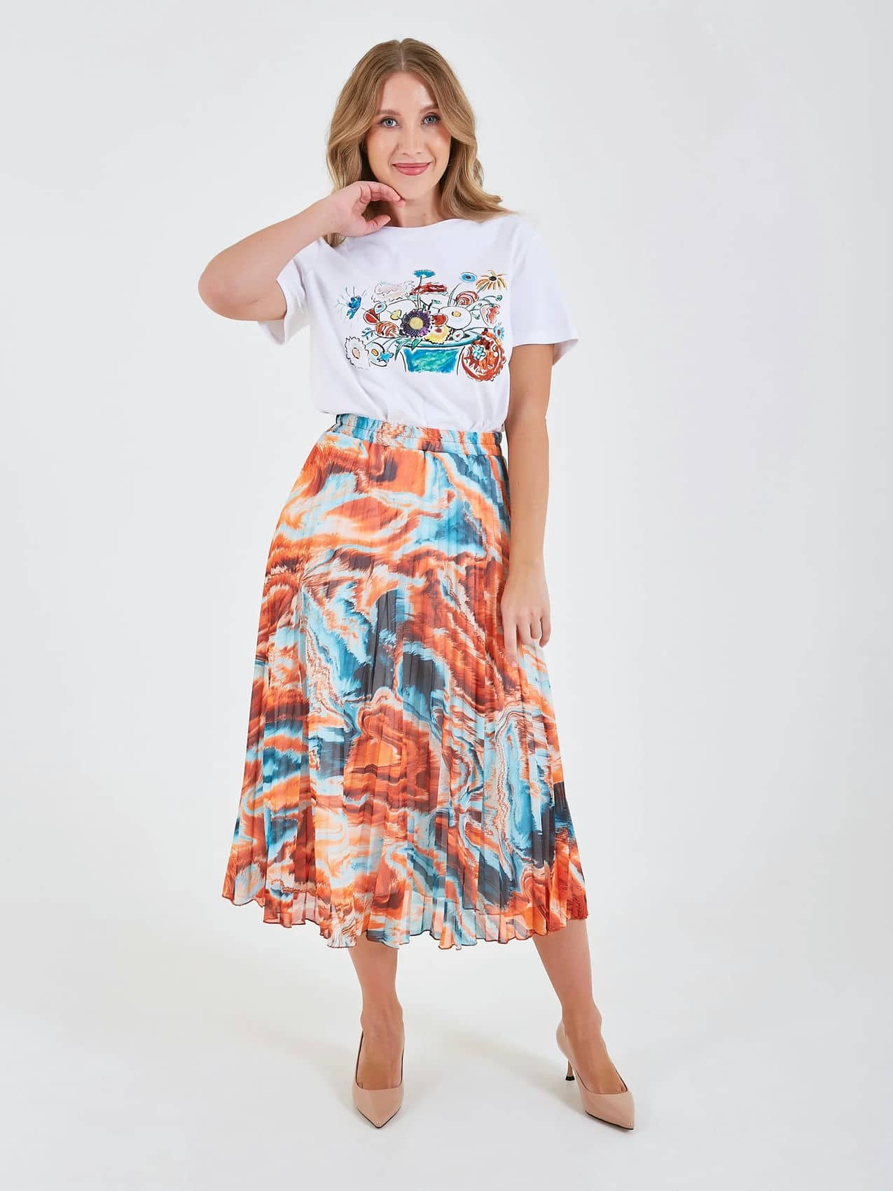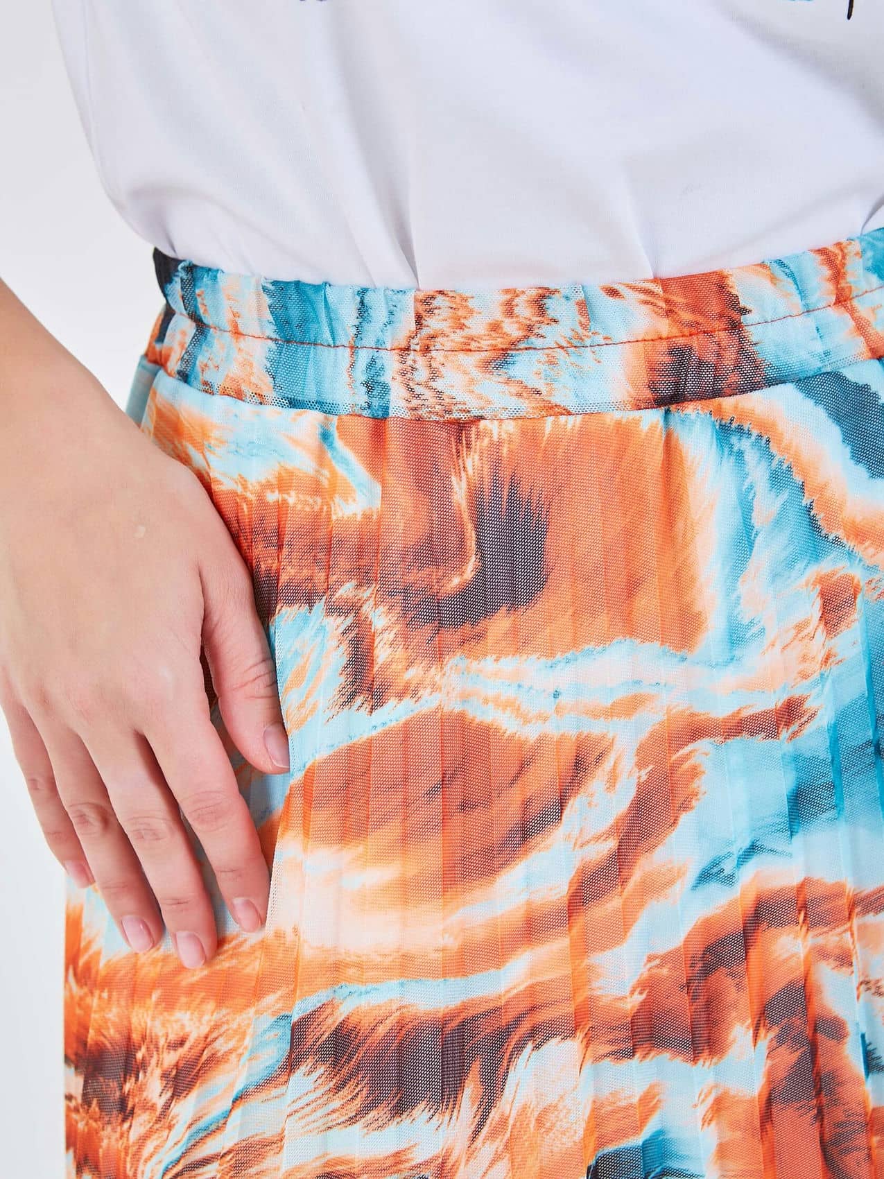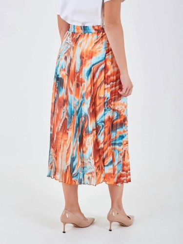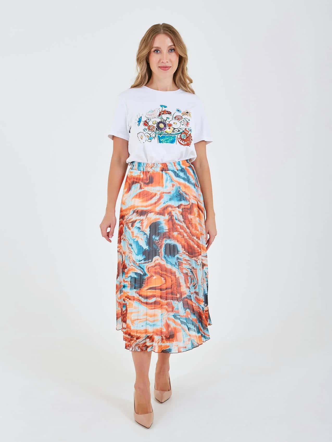 Юбка средней длины с ярким абстрактным узором в голубых и оранжевых тонах. Изготовлена из легкого, плиссированного материала, что обеспечивает удобство и хорошую посадку. Коллекция Весна-Лето 2025. Капсула "Санторини".Параметры модели: 89-70-92, рост 167, размер 44-46