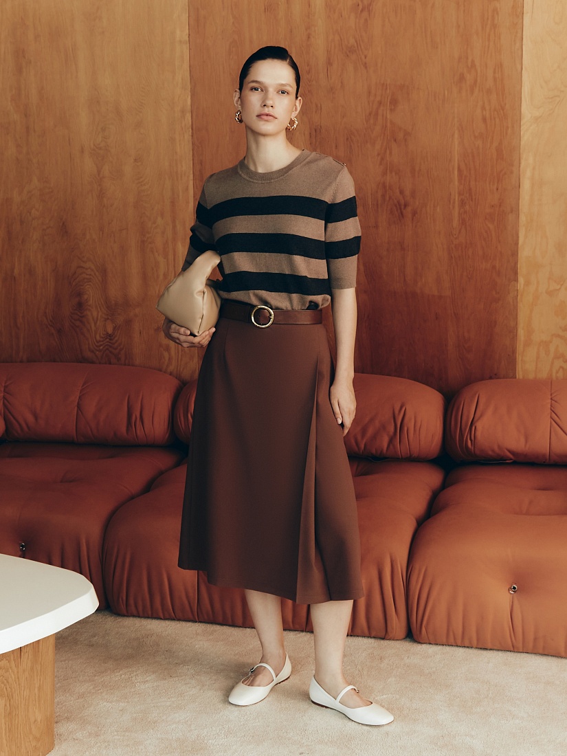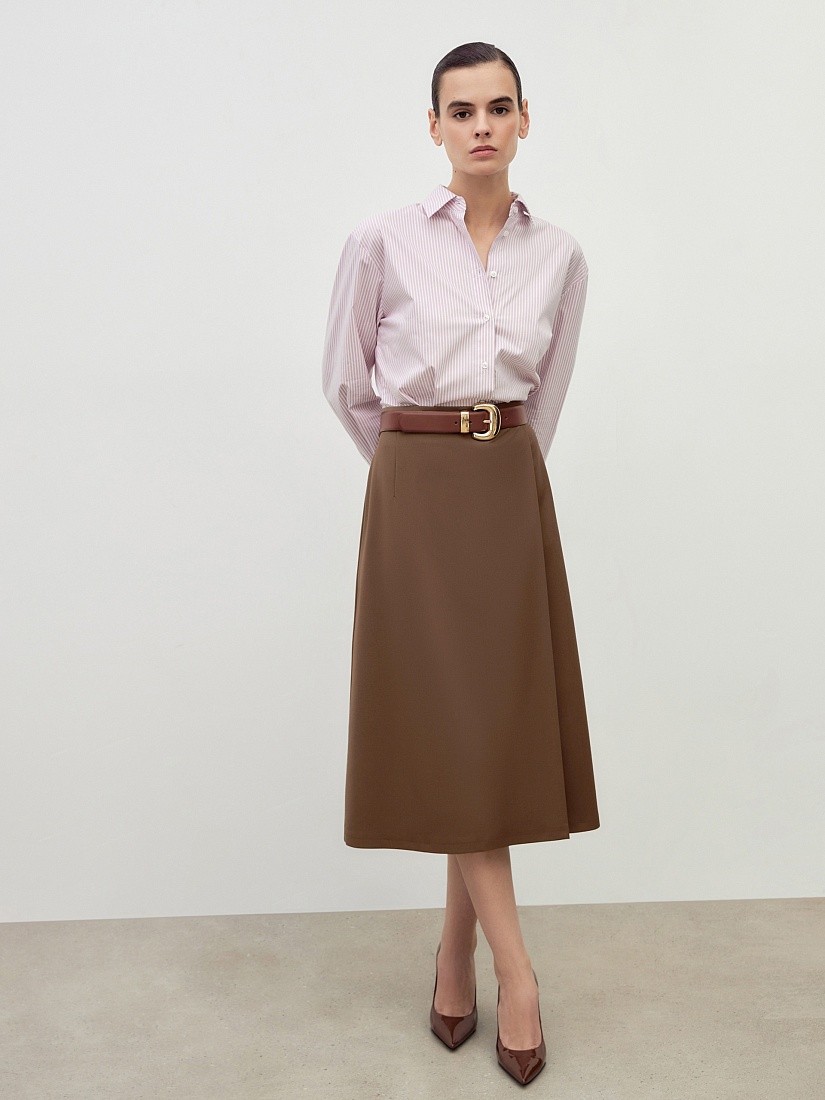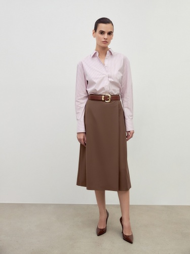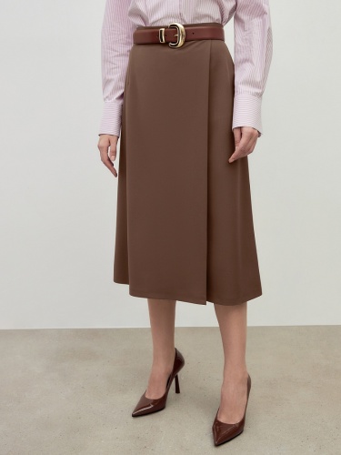 Юбка на талии, длинной миди на притачном поясе с имитацией запаха, немного расклешенная к низу. Юбка выполнена из костюмной ткани с вискозой в цвете "каштан".