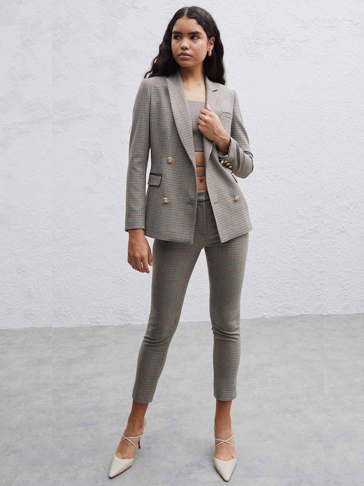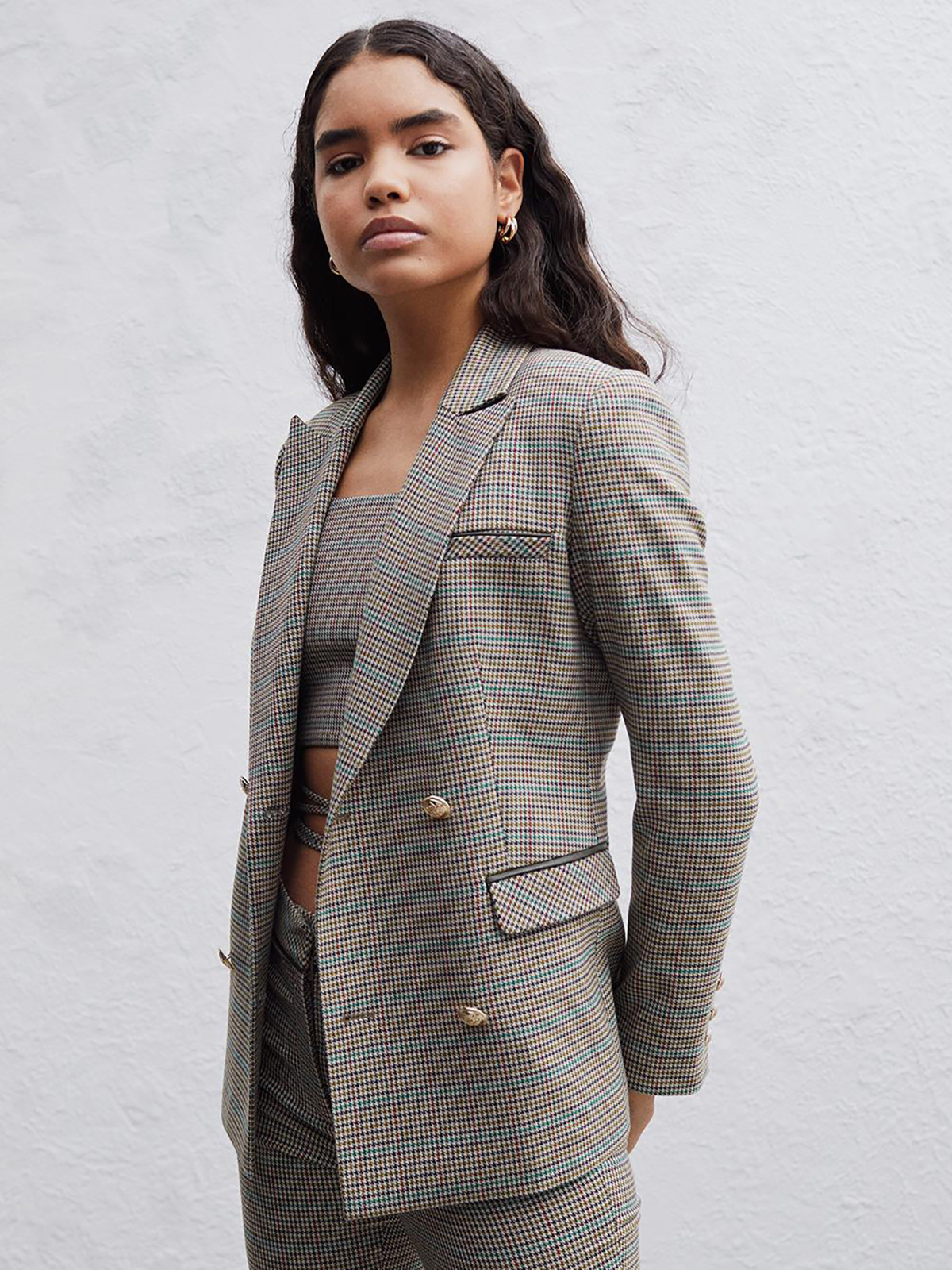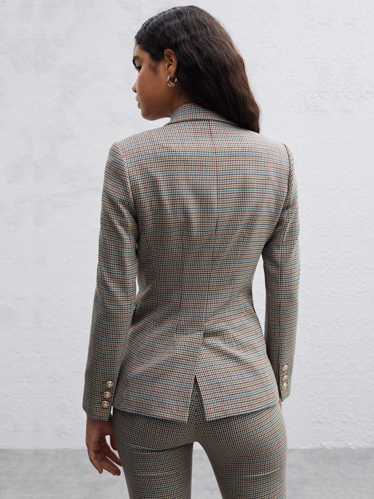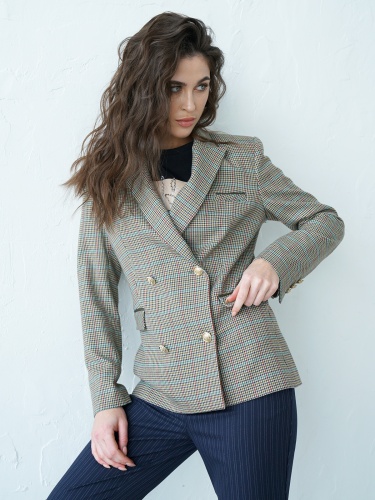 Двубортный жакет в мелкую клетку. Приталенный силуэт, английский воротник с лацканами. Длинный втачной рукав, боковые карманы с клапаном.