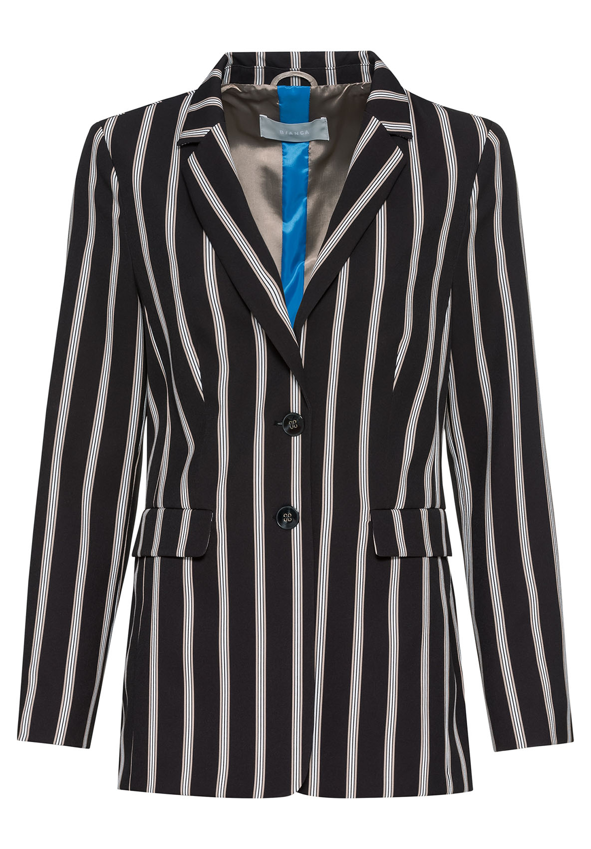 Отличный выбор - стильный жакет Joanna с принтом в полоску. Модная длина - абсолютный маст-хэв этого сезона. Эластичный материал на подкладке особенно удобен в ношении. В дизайне жакета сочетаются такие признаки классического стиля, как простой крой, воротник с лацканами, застежка на пуговице и карманы на клапанах. Длинный жакет в сочетании с джинсами и кроссовками создает современный образ. • длинный жакет в полоску • качественный эластичный материал на подкладке • узкие вертикальные полосы белого и бежевого цвета • карманы на клапанах, воротник с лацканами, застежка на пуговицах • длина около 72 см