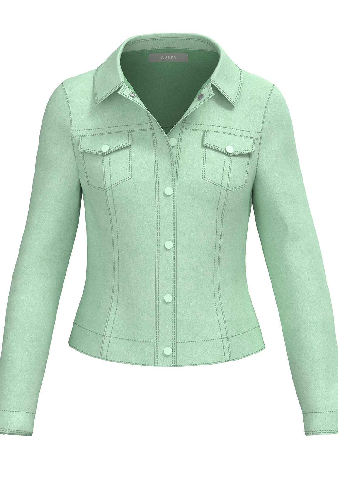 Приталенный жакет нежного мятного оттенка. Воротник с отворотами. Втачной рукав полной длины с манжетой на пуговице. Накладные карманы на груди. Застежка на клепки.