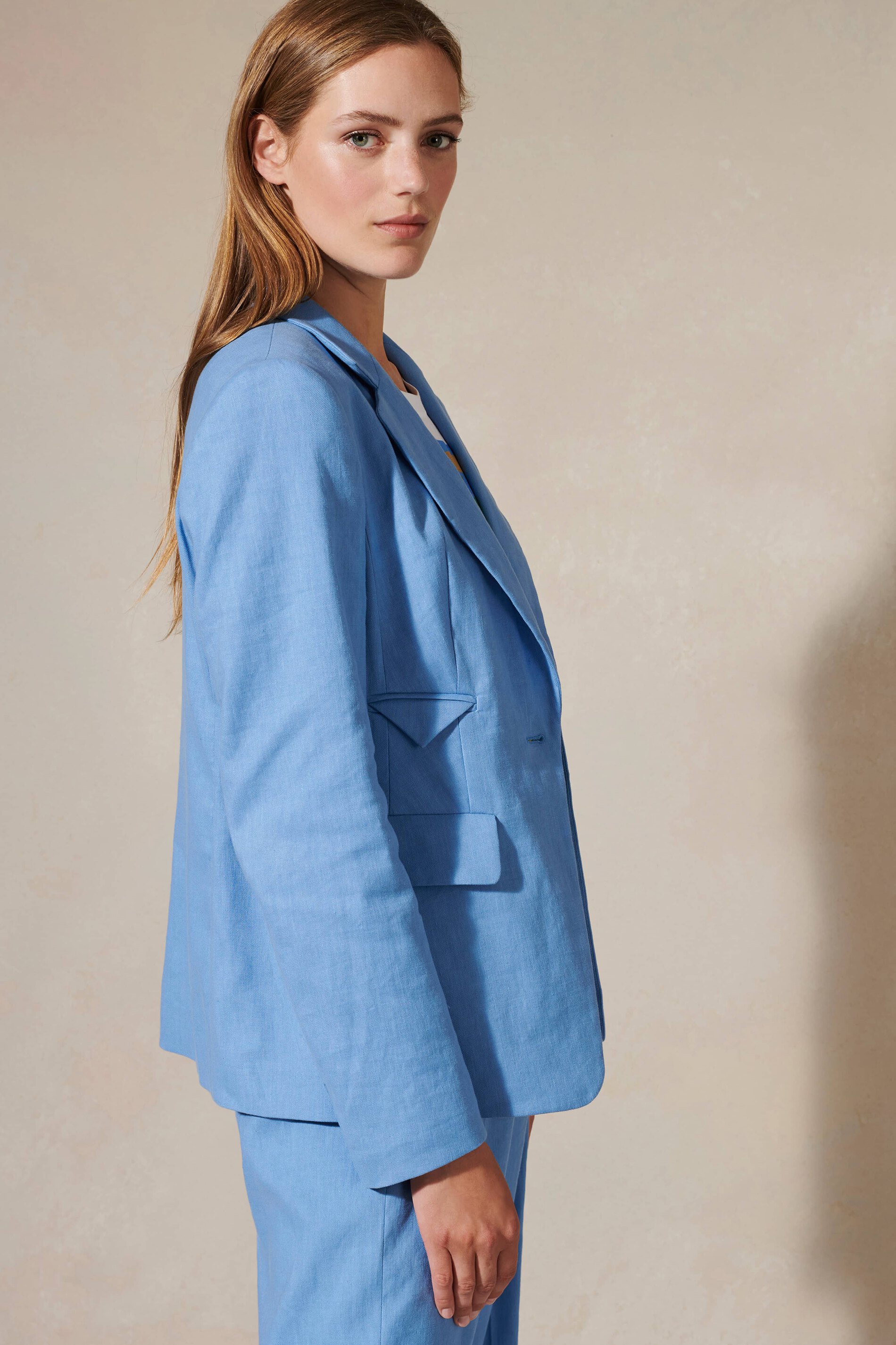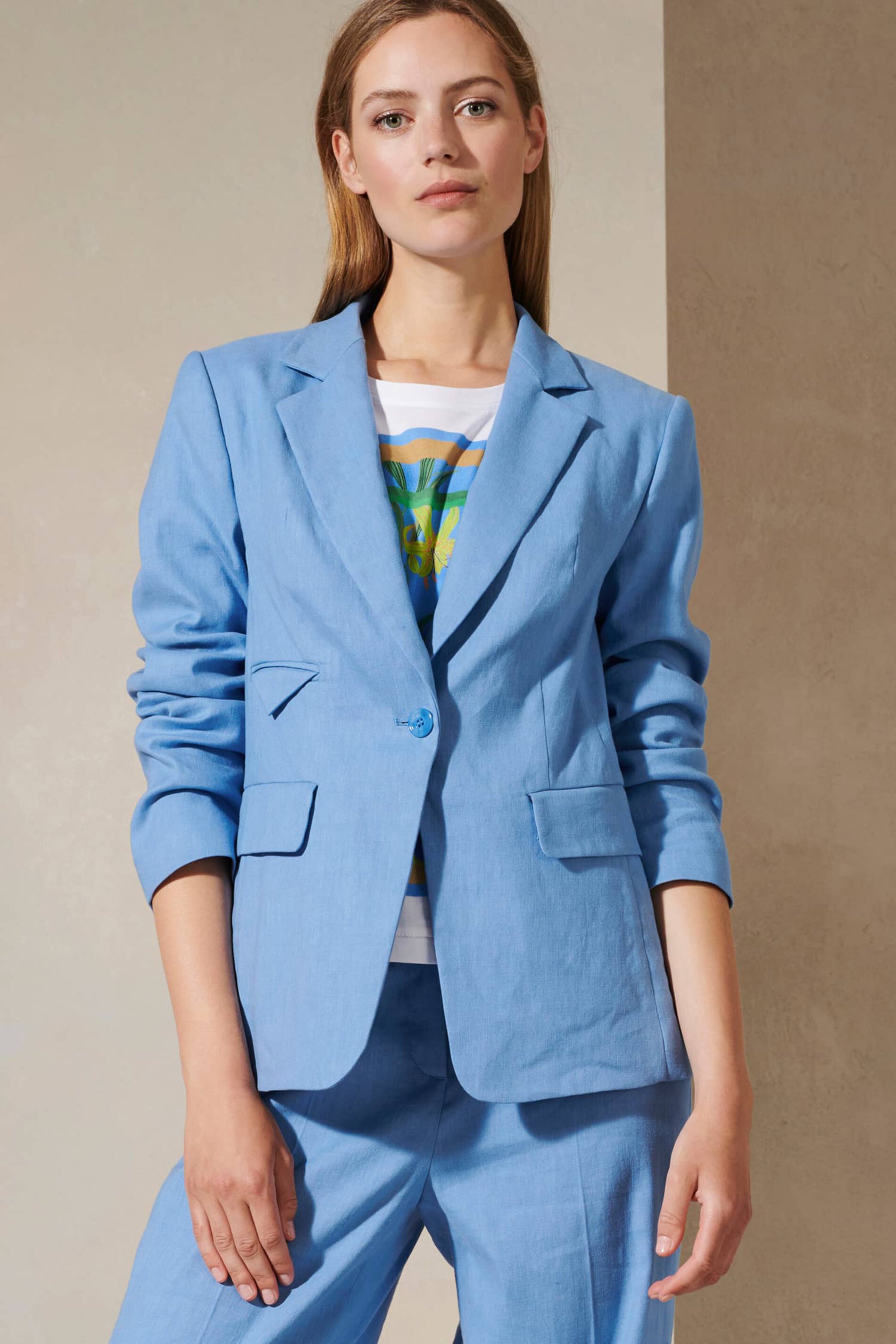 Hемецкий бренд. На сайте указаны Российские размеры. Блейзер на полуподкладке из эластичной смеси льна и хлопка габардиновой ткани. Воротник с лацканами, три кармана с клапанами и застежка на пуговицы определяют классический дизайн.