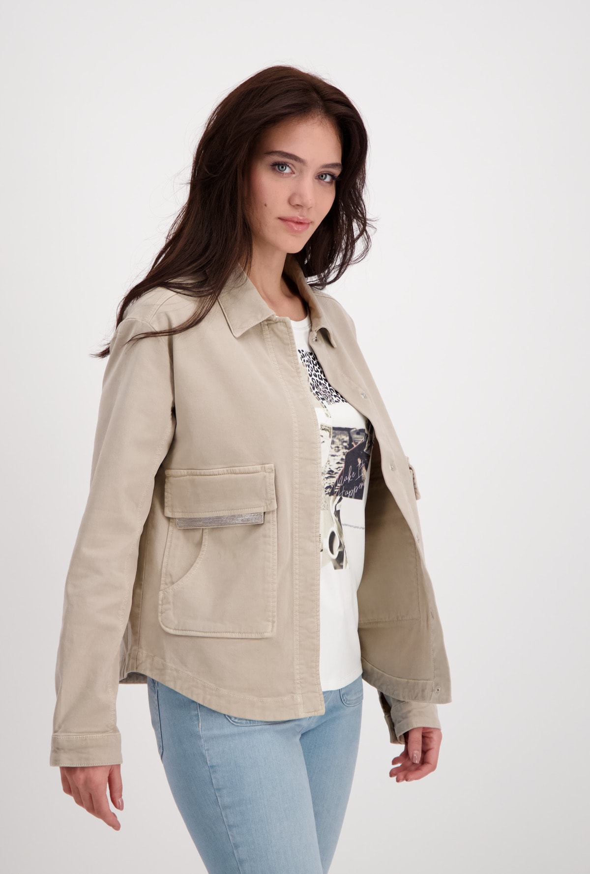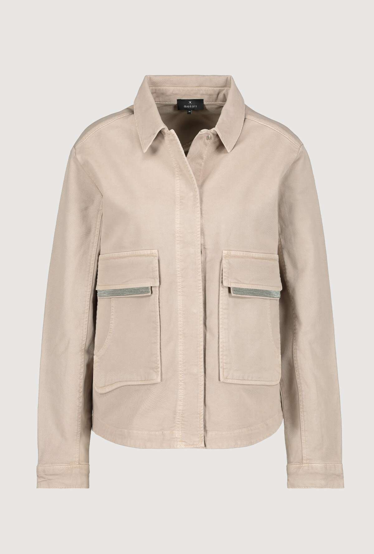На сайте указаны Российские размеры. Куртка с отложным воротником и накладными карманами. Модель с длинными рукавами и потайной планкой на кнопках отличается большими карманами с клапанами на цепочке и дополнительными прорезными карманами спереди. Форма: прямой крой с закругленным низом, отложной воротник, рукава заканчиваются разрезом и манжетами на одной пуговице. Швы: передний плечевой, продольные разделительные швы на рукавах и спинке, кокеточный шов на спинке. Параметры модели: 42 размер, рост 176 см