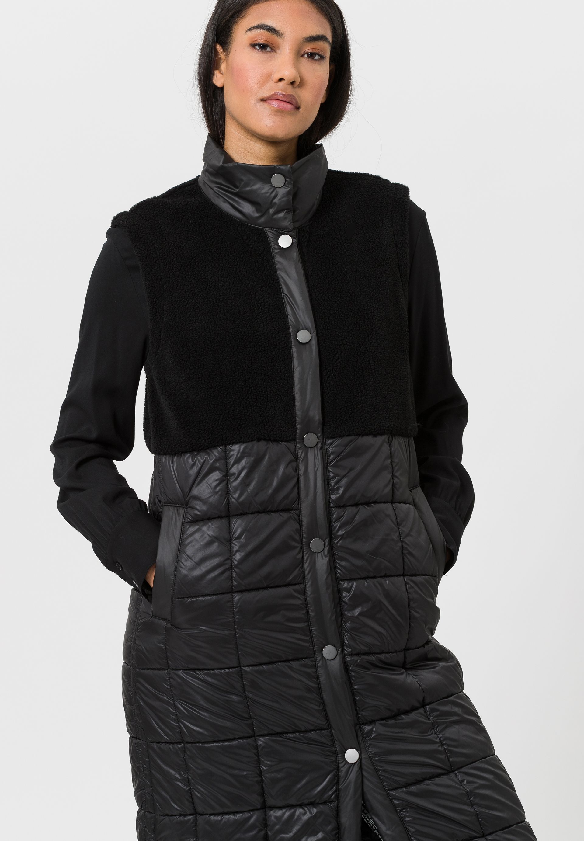 На сайте указаны российские размеры. Жилет с отделкой из искусственного меха в области плеч и груди, которые переходят в квадратный стеганый рисунок на уровне талии. Сквозная панель с кнопками легко открывается и закрывается. Высокий воротник, пуговицы по низу и боковые карманы делают образ идеальным.