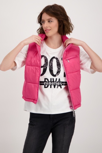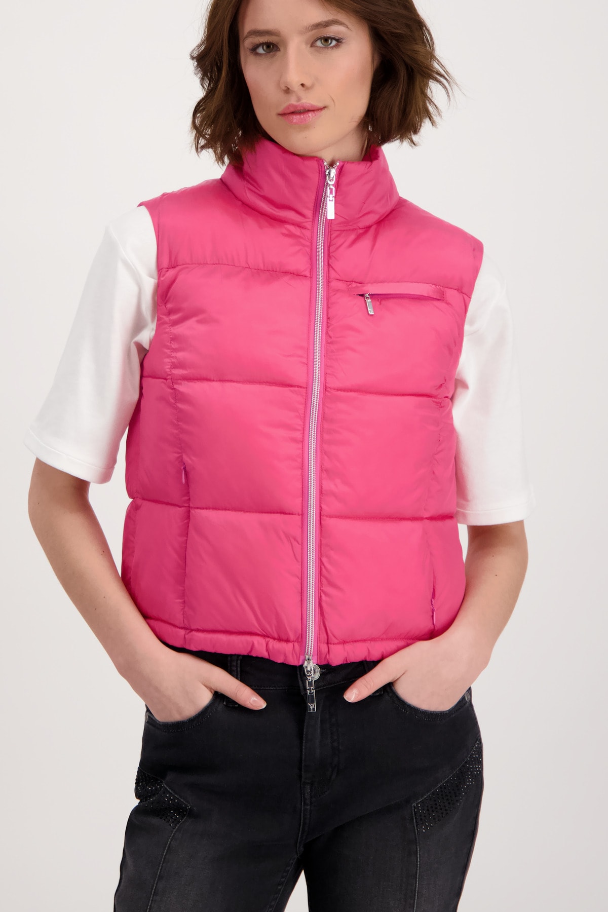 На сайте указаны российские размеры. Короткий стеганый жилет с молнией и карманами. Модель с двусторонней молнией легко расстегивается и закрывается, а передняя часть модели с воротником-стойкой дополнена двумя прорезными карманами на молнии и прорезным карманом на уровне груди. Подол легко регулируется благодаря кулиске с резинками и стопорами шнура. Подарите своим нарядам особое обновление. Модель ростом 178 см. Длина по спинке 44 размера составляет 54 см, а по переду — 56 см.