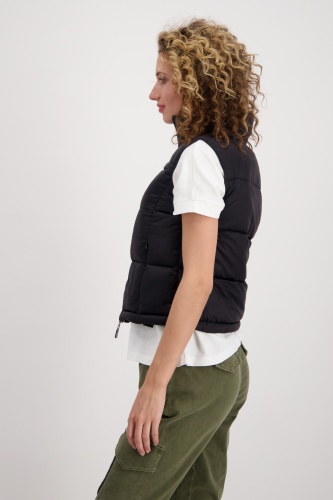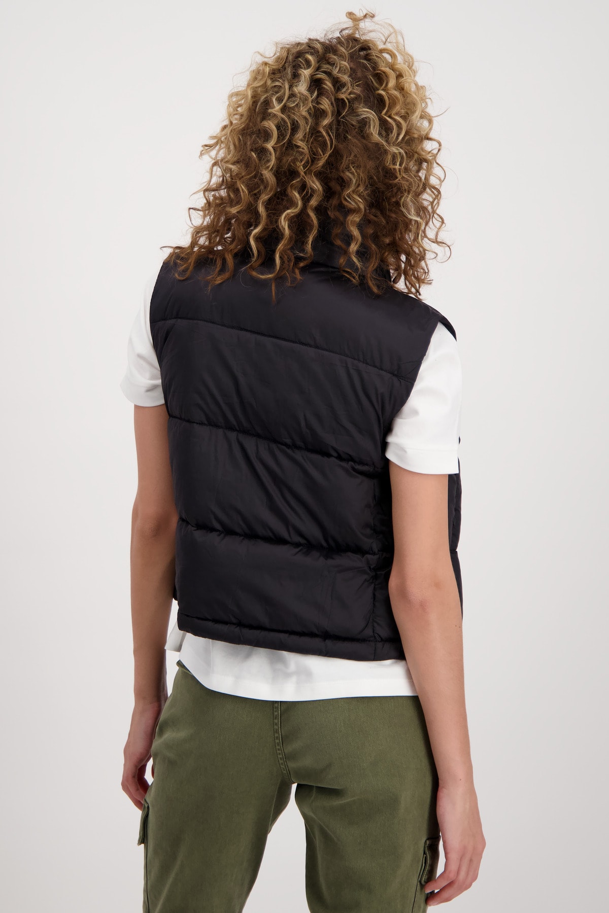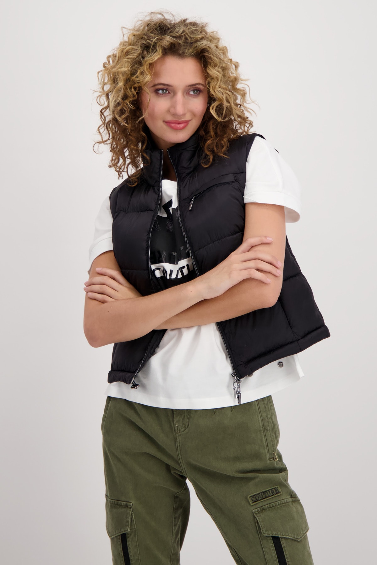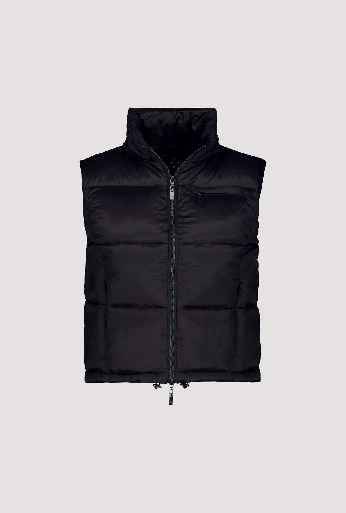 На сайте указаны российские размеры. Короткий стеганый жилет с молнией и карманами. Модель с двусторонней молнией легко расстегивается и закрывается, а передняя часть модели с воротником-стойкой дополнена двумя прорезными карманами на молнии и прорезным карманом на уровне груди. Подол легко регулируется благодаря кулиске с резинками и стопорами шнура. Подарите своим нарядам особое обновление. Рост модели 176 см. Длина по спинке 44 размера составляет 54 см, а по переду – 56 см.
