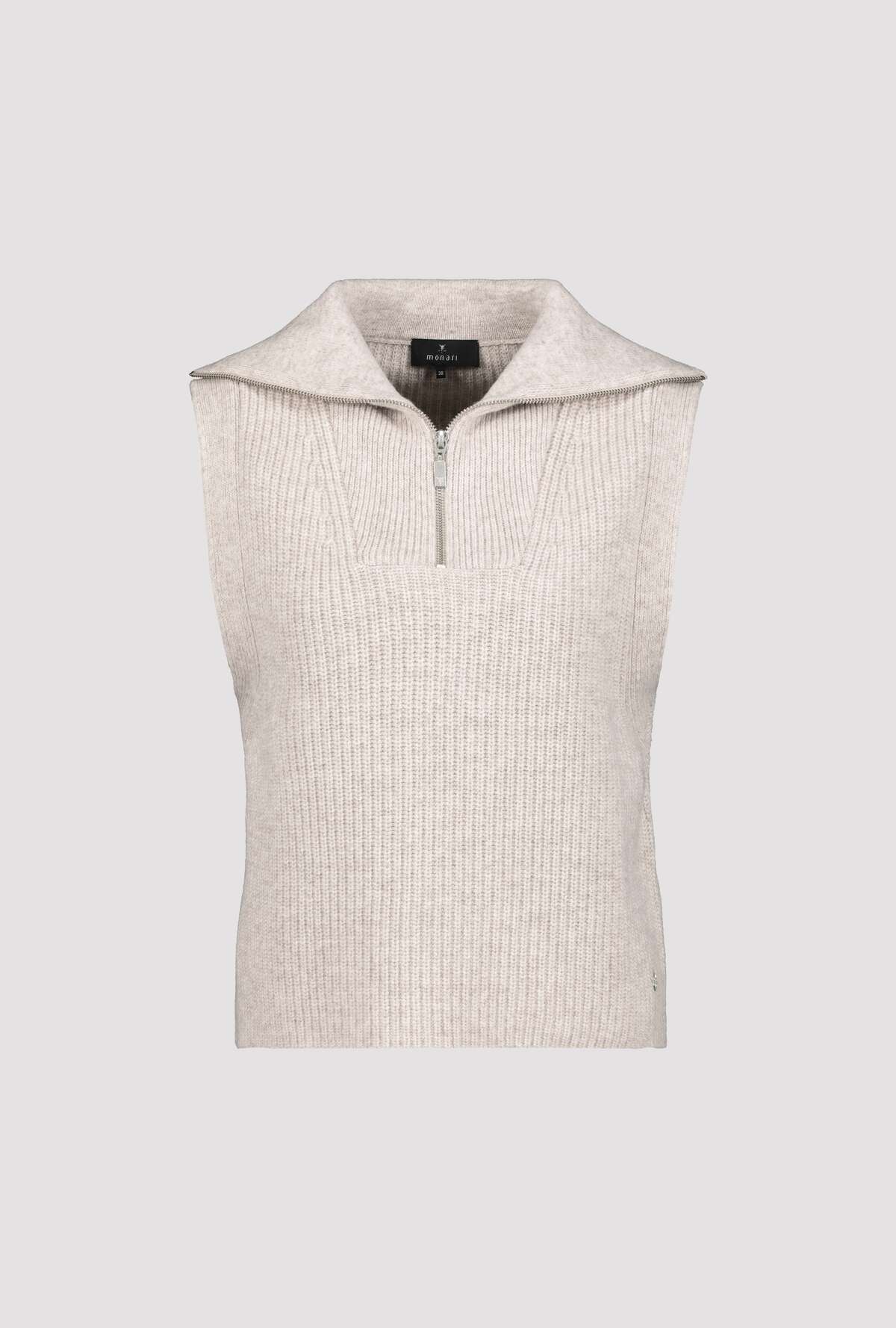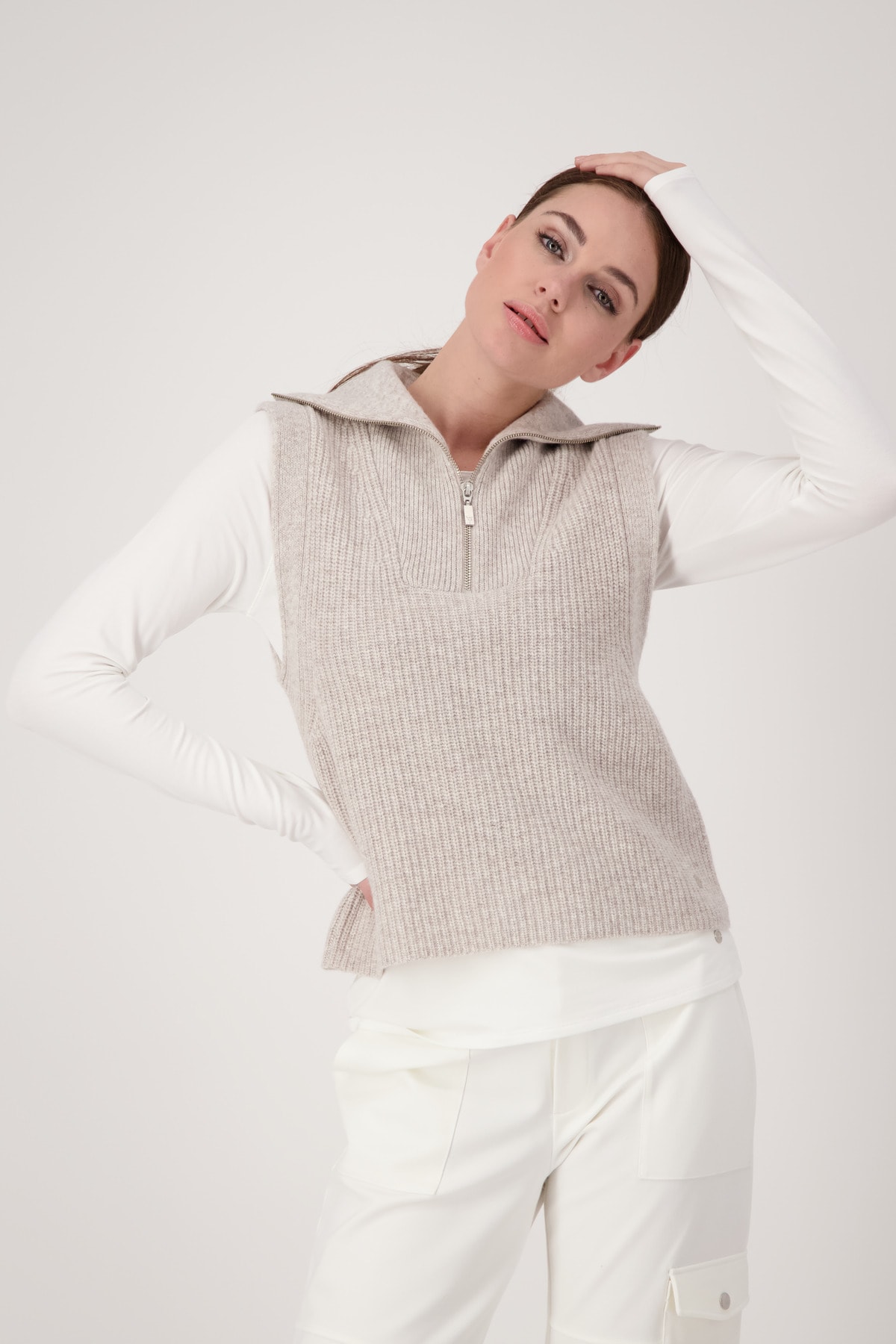 На сайте указаны российские размеры. Трикотажный жилет с застежкой-молнией и тройным воротником. Безрукавка имеет широкик манжеты на несуществующих концах рукавов. Трикотажный комбинезон из мягкой шерсти гарантирует непревзойденный комфорт. Незаменимая вещь в каждом гардеробе! Модель ростом 179 см. Длина спины 44 размера составляет 62 см.