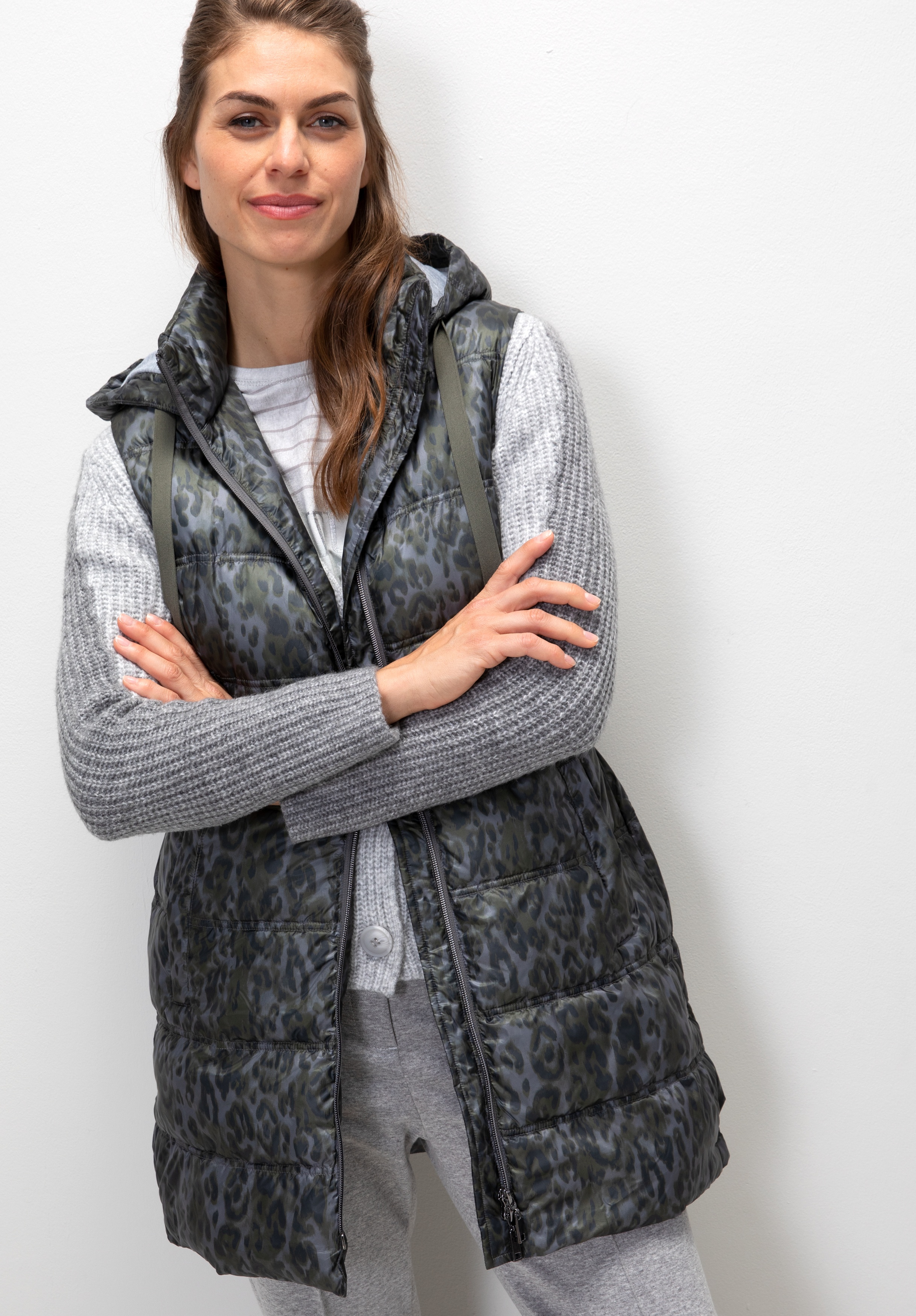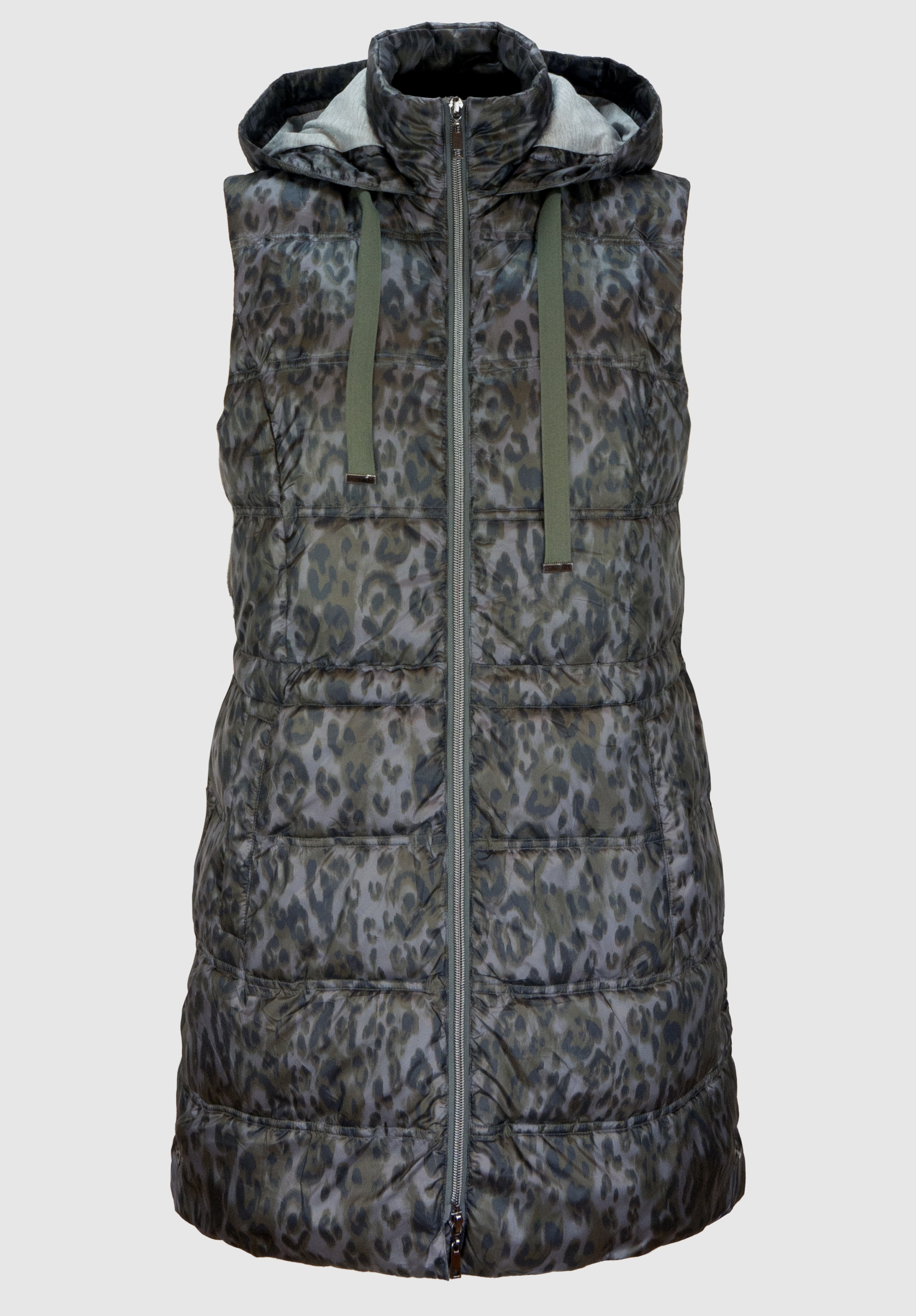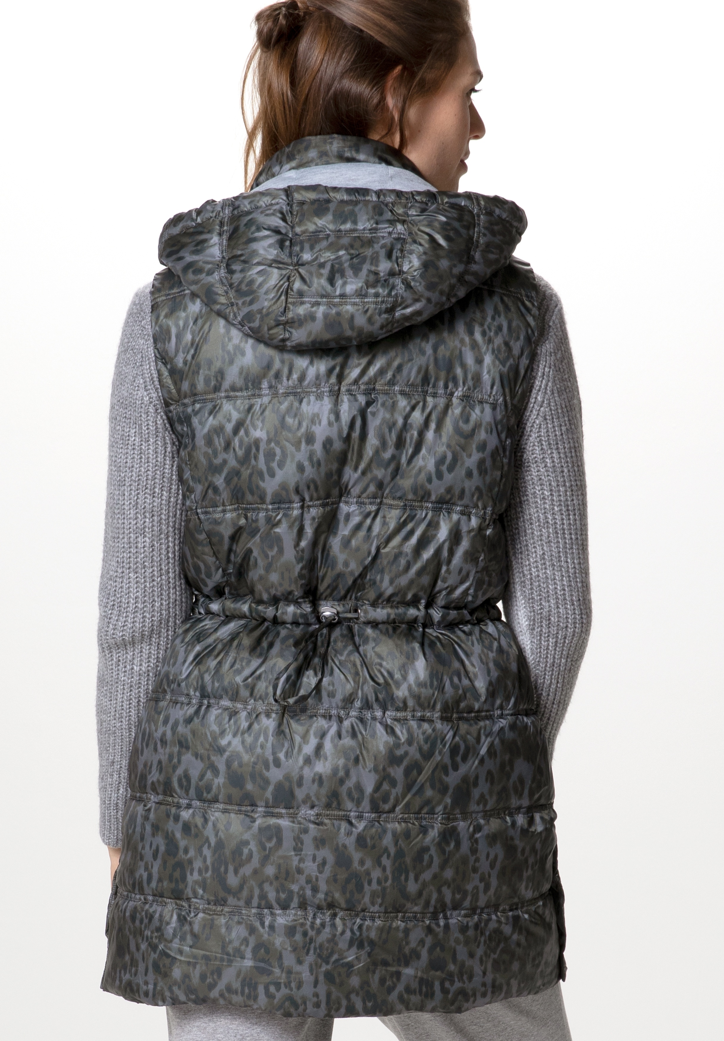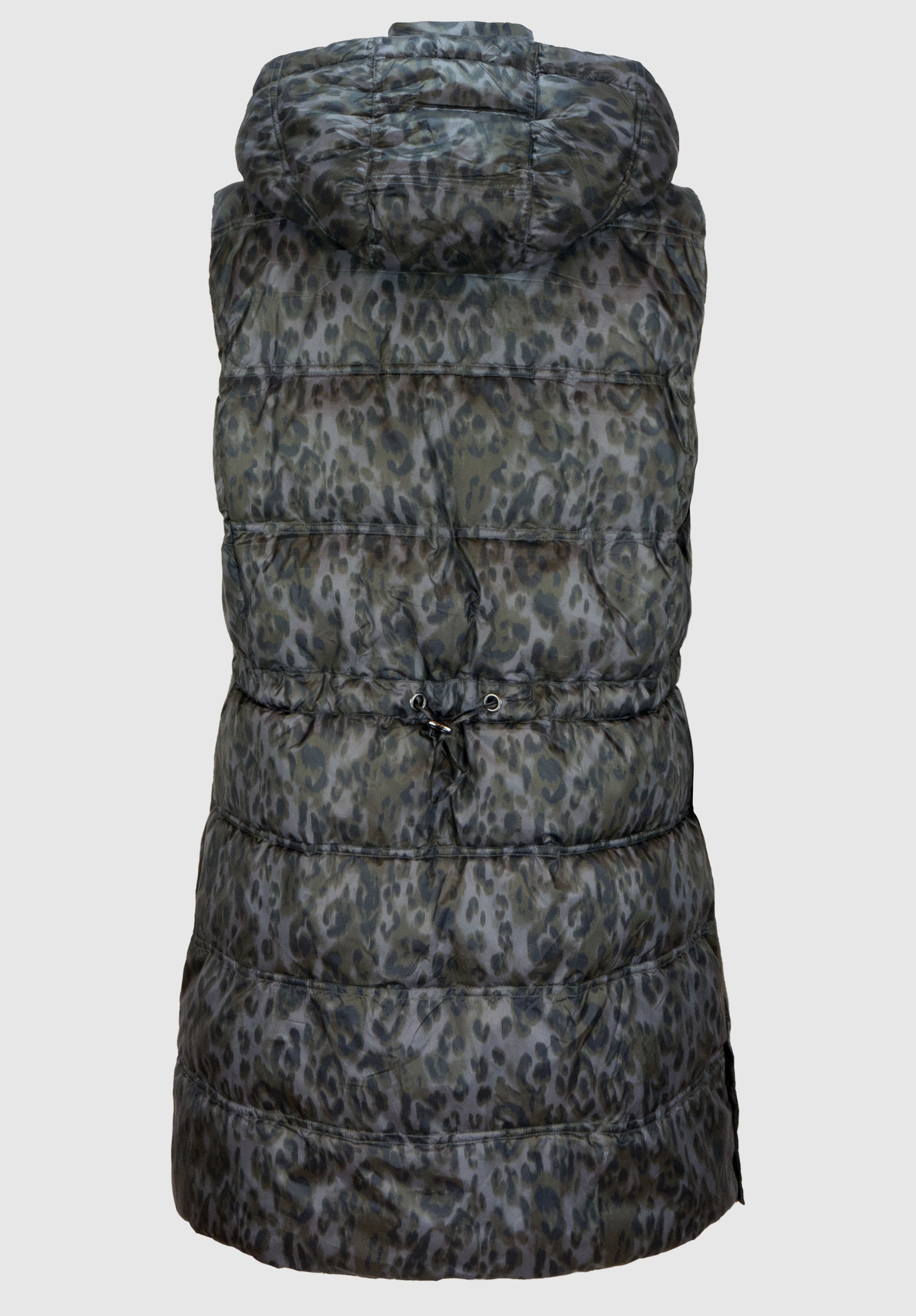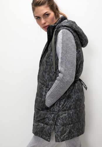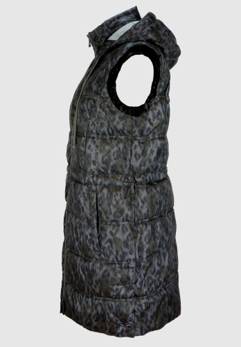 На сайте указаны российские размеры. Стеганый жилет впечатляет модным анималистическим принтом и многими другими деталями. Благодаря высококачественному материалу и прямому крою его очень удобно носить. Воротник-стойка в сочетании с капюшоном и завязками делают жилет идеальным компаньоном в холодные дни. Боковые карманы и боковые разрезы завершают повседневный образ жилета без рукавов. Длина модели в 44 размере около 83 см.