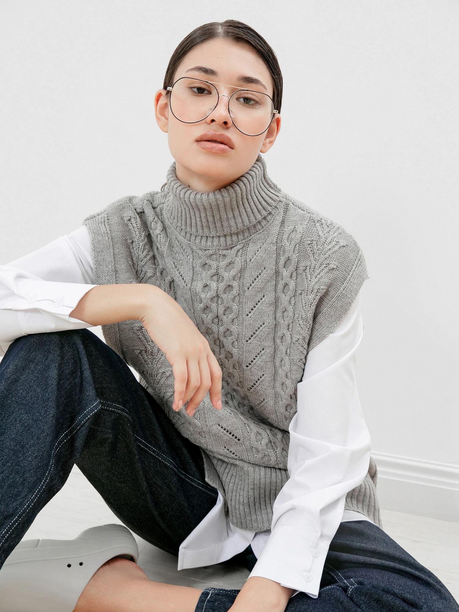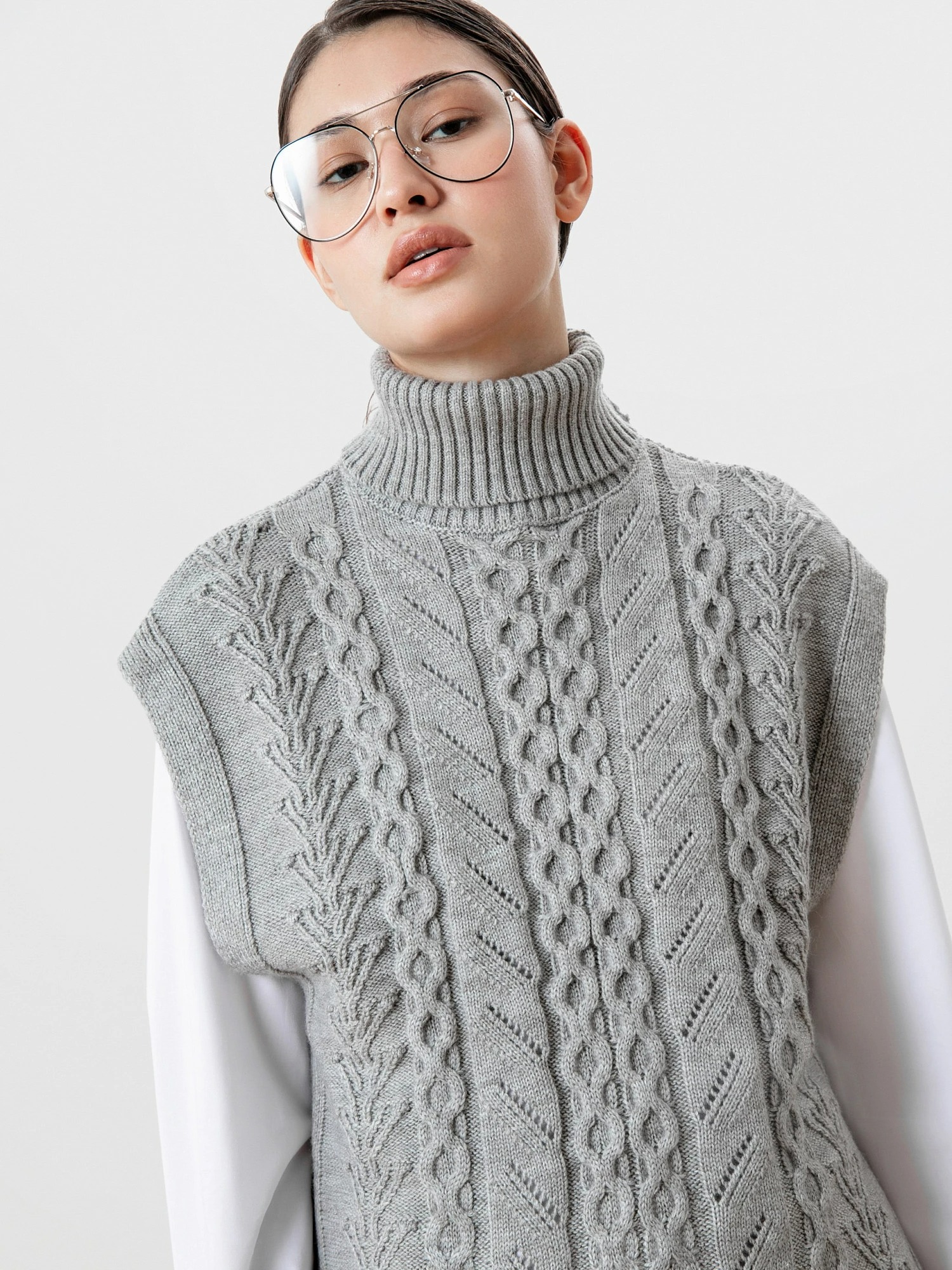 На сайте указаны российские размеры. Уютный жилет из фактурного вязаного трикотажа прямого свободного силуэта с широким воротником-стойка, резинкой и разрезами по низу. Прекрасная вещь для второго слоя при создании утепленных осенних образов. Рост модели на фото - 175 см.