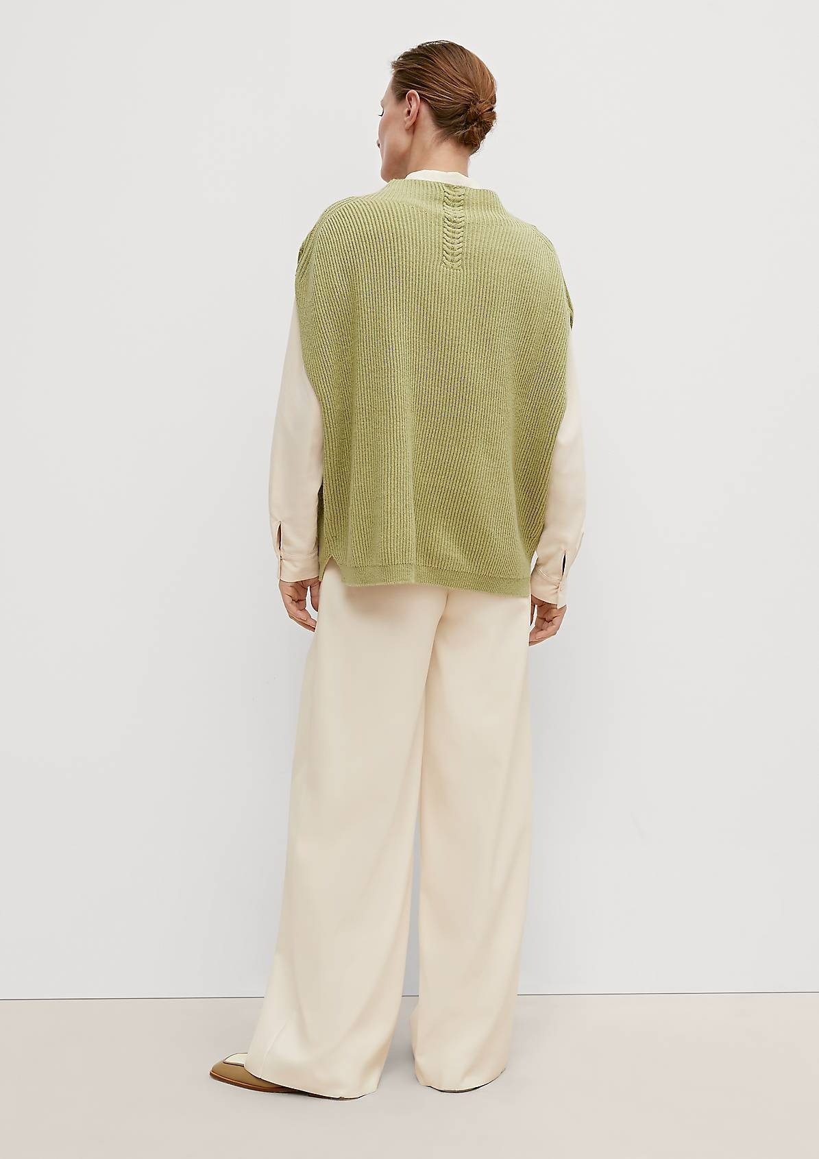 На сайте указаны российские размеры. Пончо из смесовой шерсти свободного кроя. Без рукавов, заниженная линия плеча. Длина по спинке 62 см. Рост модели 179 см.