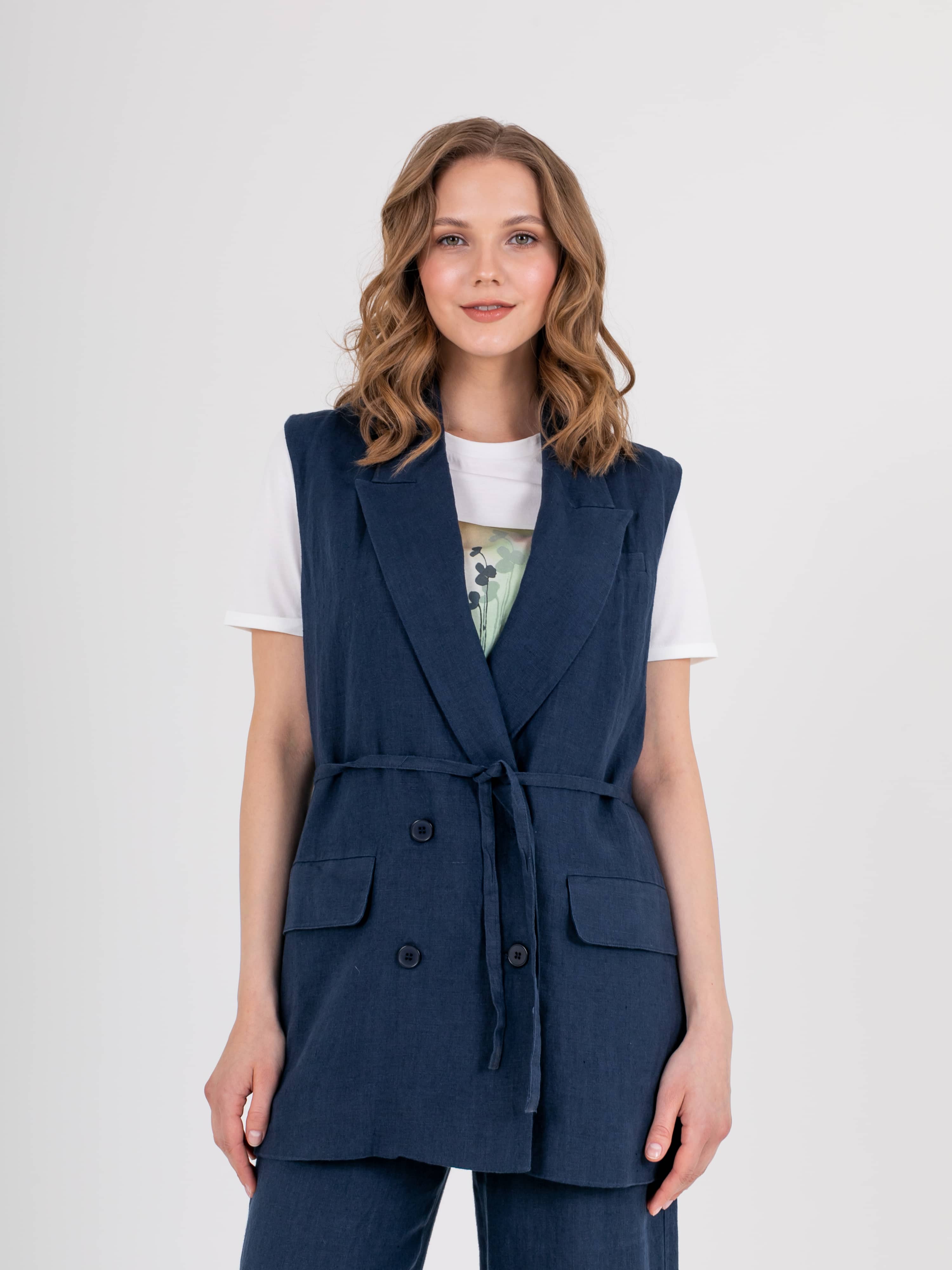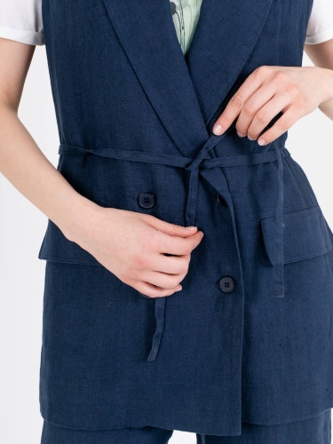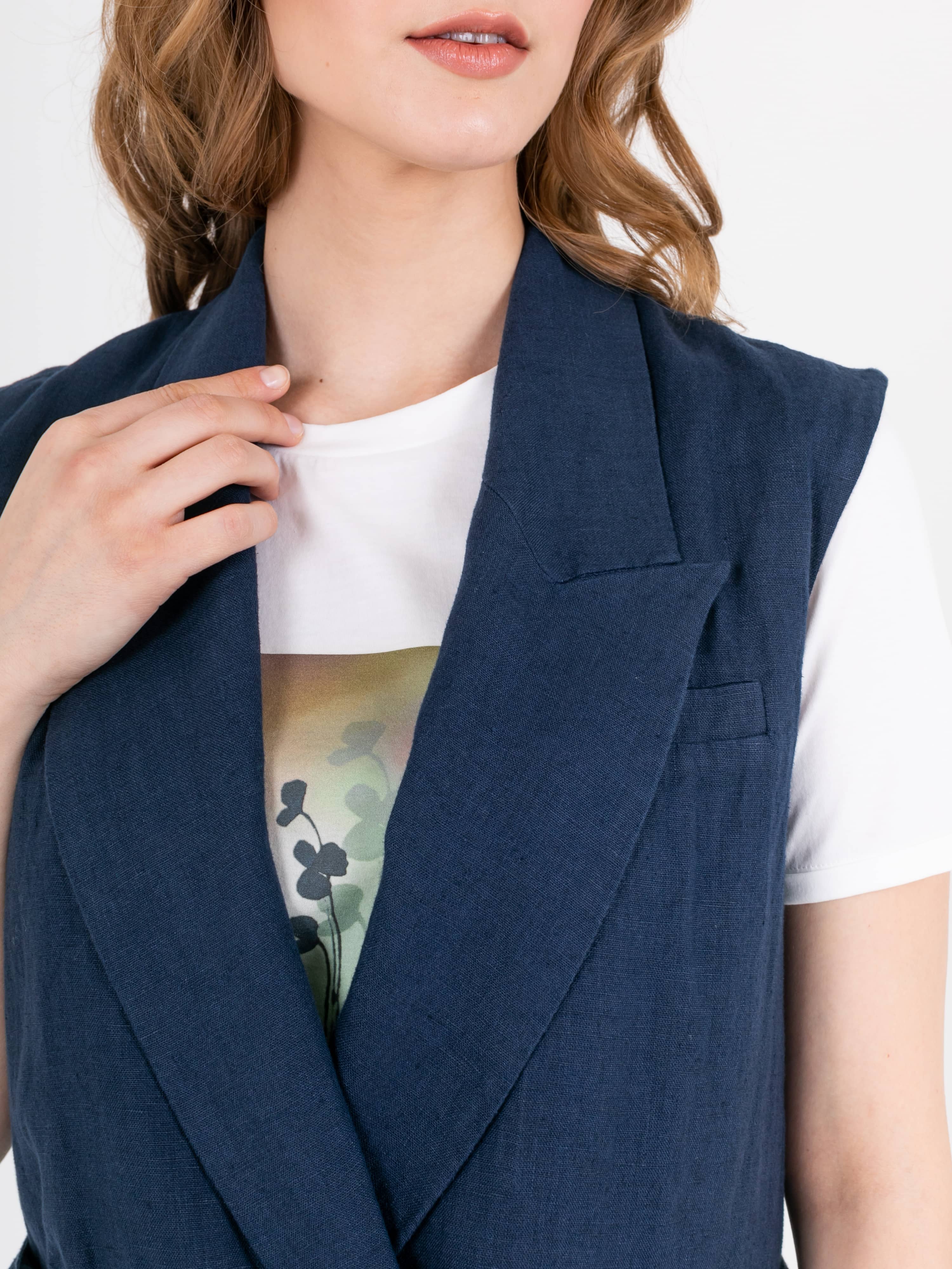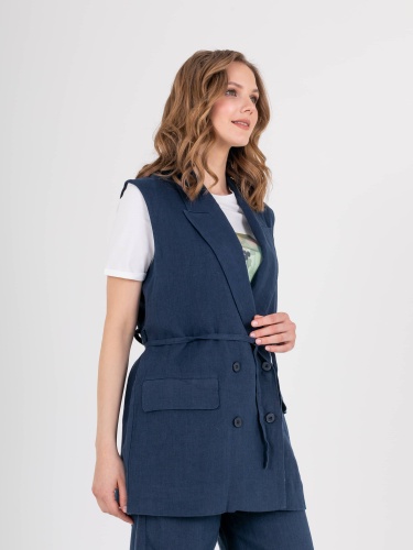 Жилет удлиненный прямого силуэта, с застежкой на две прорезные петли и пуговицы из 100% льна. Перед на запах со шлевками и съемным поясом, в области груди расположен карман с листочкой, а также прорезные карманы с клапанами. Спинка со средним швом и шлицей. Воротник пиджачного типа.