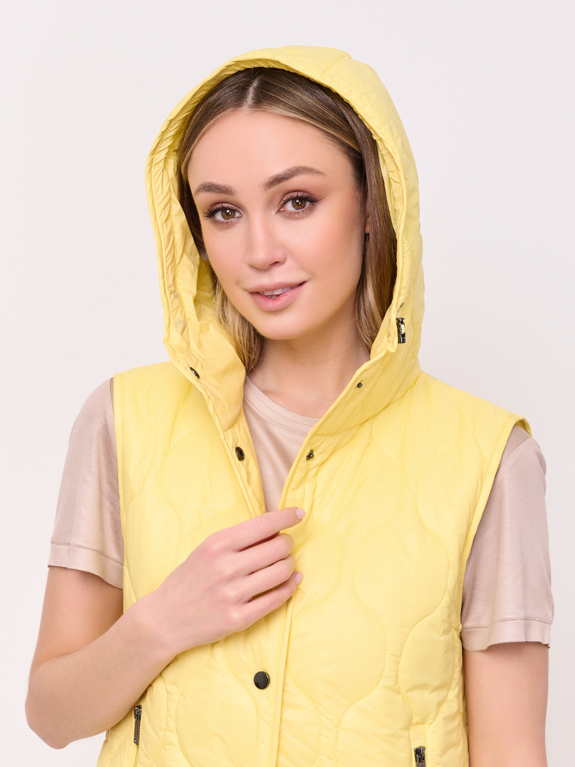 Детали: застежка кнопки, с капюшоном, покрой полуприталенный, кулиска по линии талии на спинке, без рисунка, утеплитель полиэстер, карманы прорезные, модель жилета утепленный. Длина по спинке: 64 см. Плотность утеплителя: 80