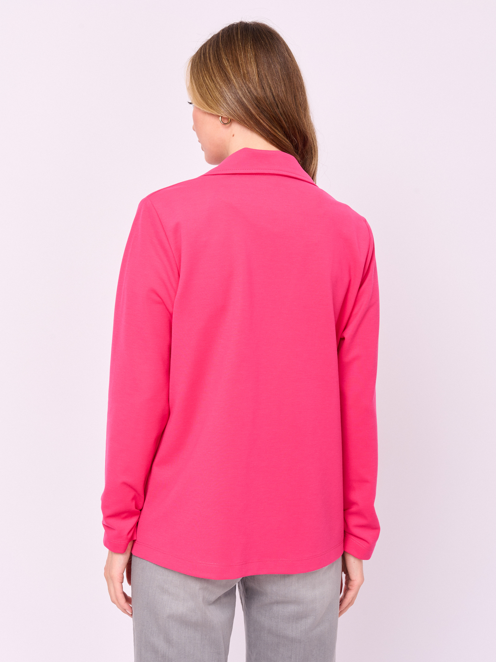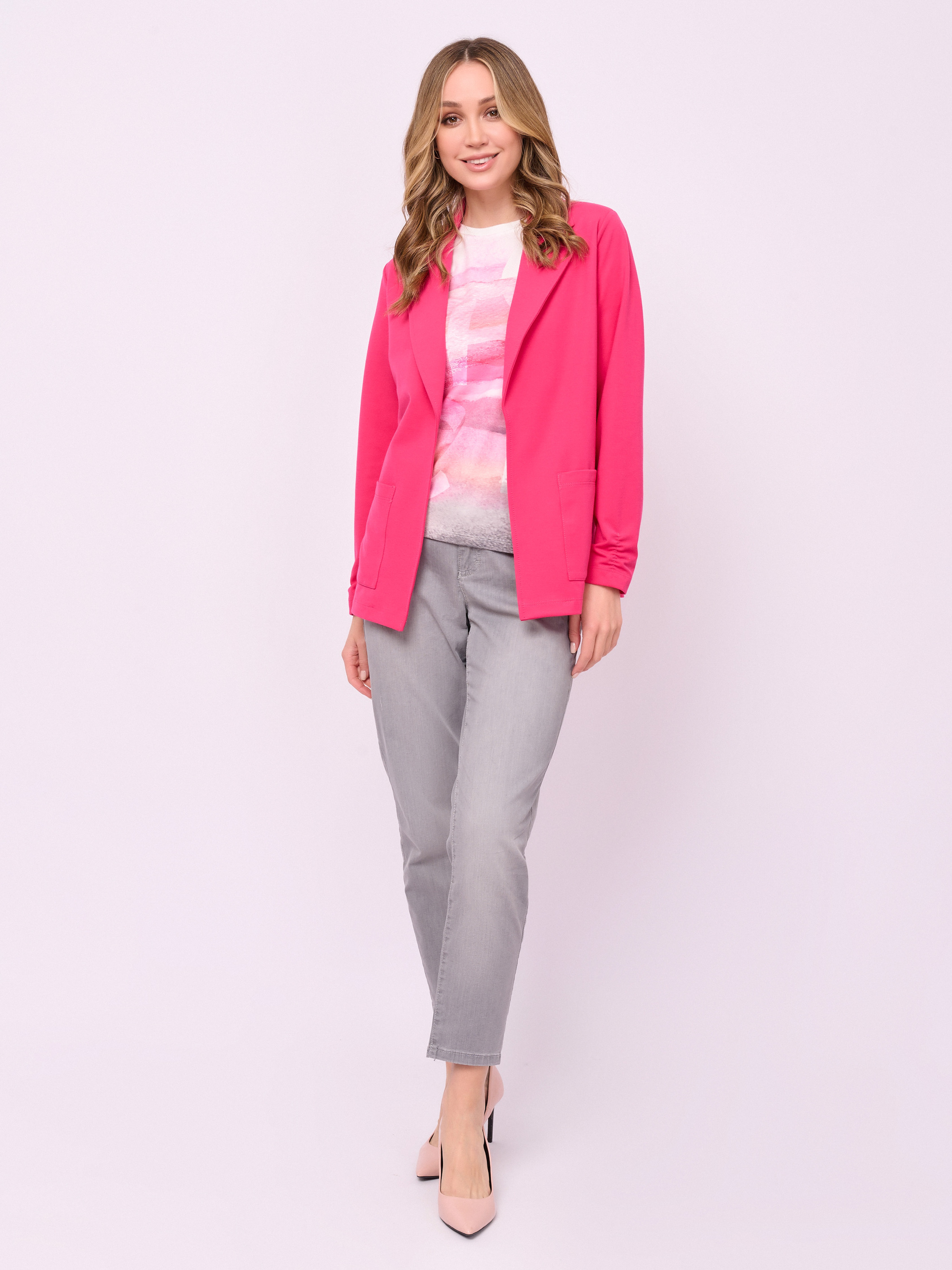 Детали: без застежки, вырез горловины английский воротник, рукава длинные, карманы накладные, присборенные рукава, прямой покрой. Длина по спинке: 66 см.