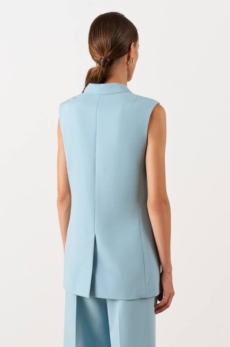 Удлиненный двубортный жилет прямого силуэта, выполнен из костюмного полотна. Отложной воротник с лацканами. Застежка на роговые пуговицы. Спереди имитация карманов с клапанами. Средний шов спинки заканчивается шлицей. Дополняется поясом из основного полотна с металлическими полукольцами. По обтачке выполнена дизайнерская вышивка «Флора».