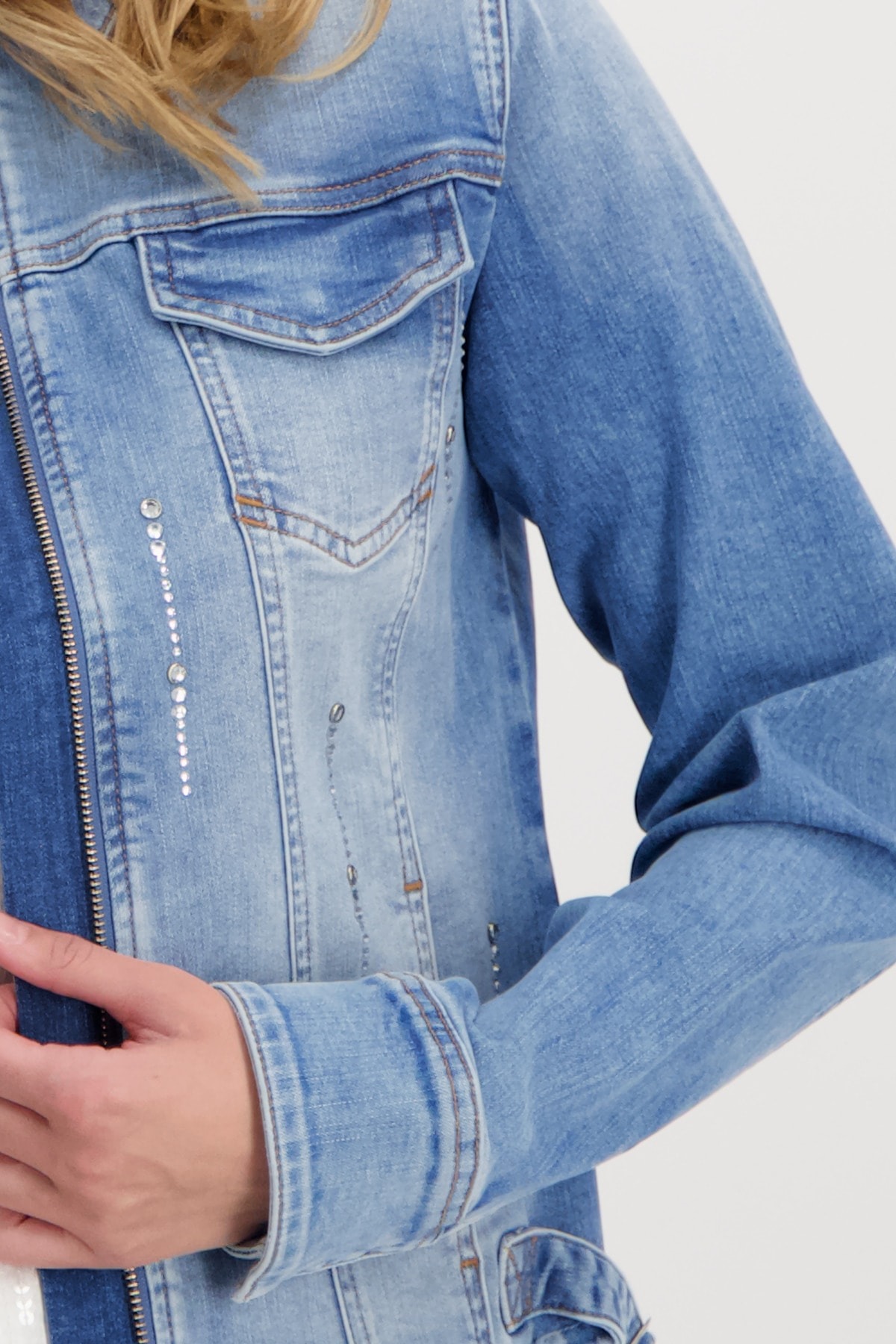 Стильная джинсовая куртка с мерцающими полосками из стразов. Закругленный подол с бахромой подчеркнут закрепкой. Регулярная посадка. Длинный рукав. Подол рукава с разрезом и манжетами. Накладные карманы с клапанами на уровне груди. Длина 44 размера 55 см.