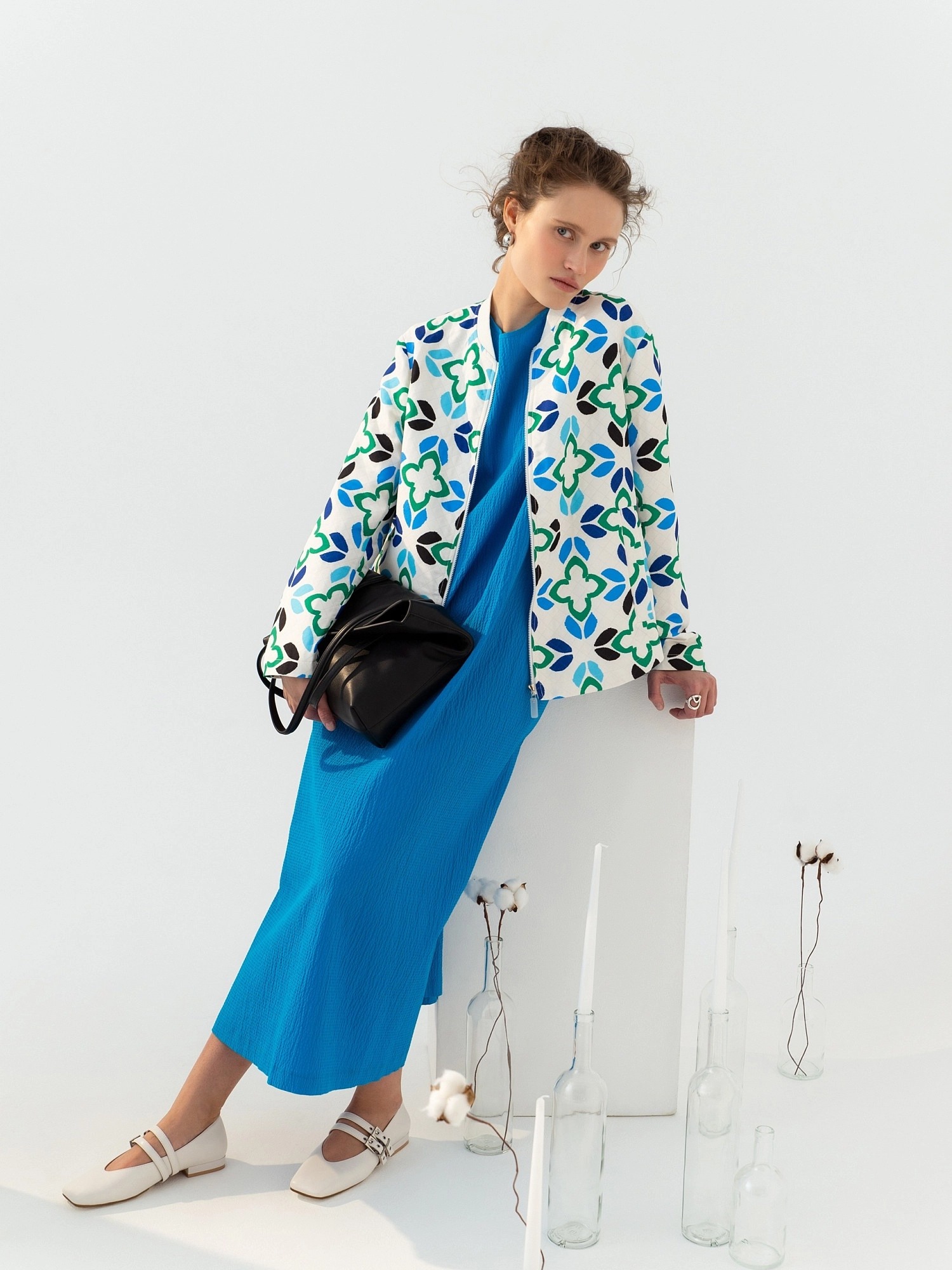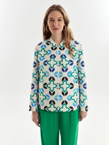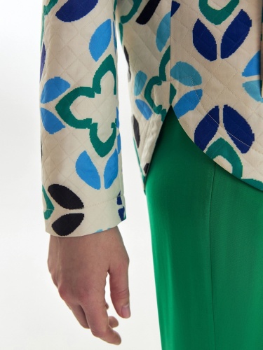 Жакет на молнии в принтованной ткани с лазерной стежкой с воротником-стойкой из кошкорсе. Жакет со спущенным плечом и прорезными карманами-листочками по борту. Длина переда и спинки на разном уровне.