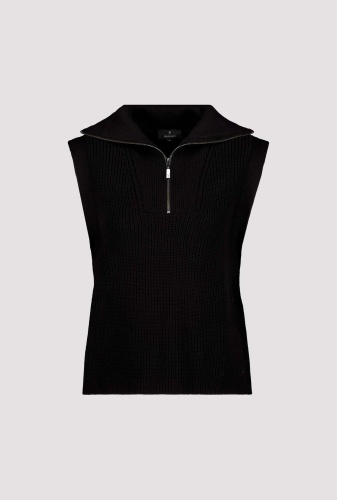 На сайте указаны российские размеры. Трикотажный жилет с тройным воротником и молнией. Модель прямого кроя с застежкой-молнией на воротнике Troyer и вязаной манжетой на ложных концах рукавов. Модель без рукавов представляет собой женственную структуру Perlfang и обещает удобную посадку благодаря производству высококачественного хлопка, смешанного с полиакрилом. Модель ростом 178 см.