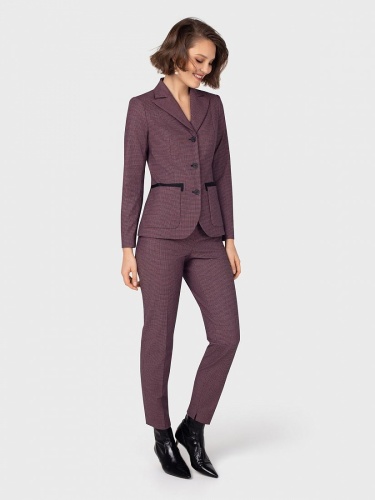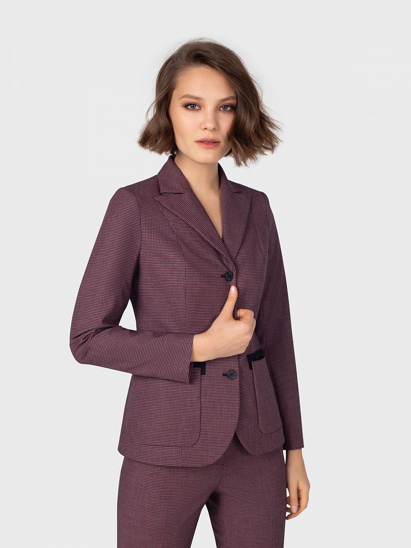 Классический жакет полуприлегающего силуэта на подкладке с втачным рукавом полной длины, классическим отложным воротником и прямоугольными накладными карманами. По верху карманов контрастная декоративная отделка. Застежка спереди на пуговицы.