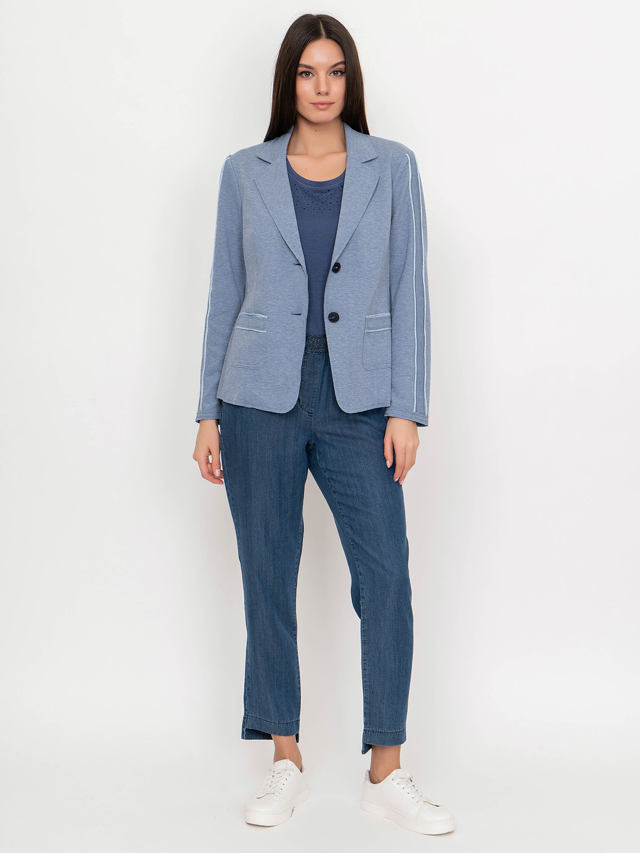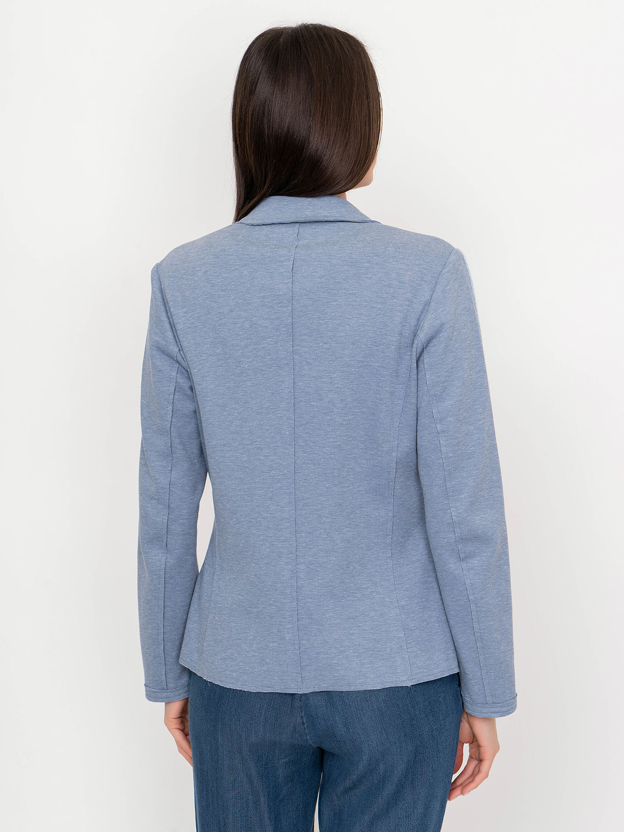 Жакет с лацканами. Застежка на пуговицах. Накладные карманы. Отделка на рукавах и карманах. Базовая модель в нейтральном цвете. Длина изделия по спинке: 60 см.