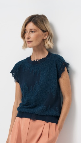 Жилет свободного прямого силуэта изготовлен из качественной смесовой хлопковой пряжи, обеспечивающей прочность и долговечность изделия. Жилет дополнен гранжевыми деталями, имитирующими распущенные протяжки по пройме и низу изделия, что придаёт базовой форме почти художественный вид. Цвет «синяя глубина» отлично сочетается с различными оттенками в комплектах.